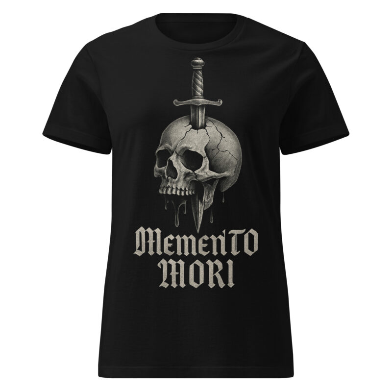 Semi-fitted t-shirt i svart med en dödskalle med ett svärd genom huvudet och texten ’Memento mori’ som dekoration på framsidan. Passar perfekt till kvinnor som älskar den alternativa klädstilen. Tröjan är tillverkad i en supermjuk kvalitet i 100% bomull.