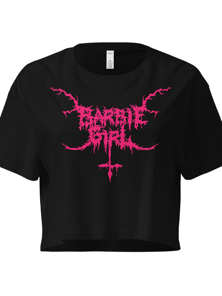 Snygg crop top dekorerad med texten ’Barbie girl’ i ett black metal-typsnitt på framsidan. Tillverkad i kammad bomull i en fin kvalitet. Passar alla alternativa Barbies.