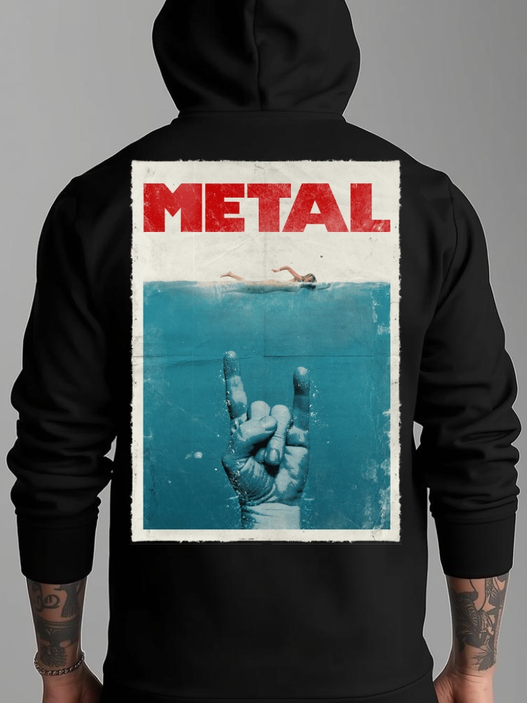 Hoodie med dragkedja och ett stort tryck på ryggen. Trycket är dekorerat med en välkänd omgjord filmposter med den nya texten ’Metal’. Passar perfekt till både män och kvinnor, materialet är blandad bomull och polyester.