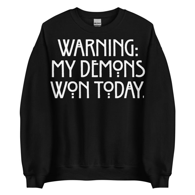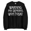 Varm och skön sweatshirt i svart tillverkad i blandad bomull/polyester med texten ’Warning: my demons won today’ som dekoration på framsidan. Tröjan passar perfekt till både män och kvinnor som älskar den alternativa stilen.