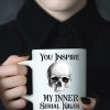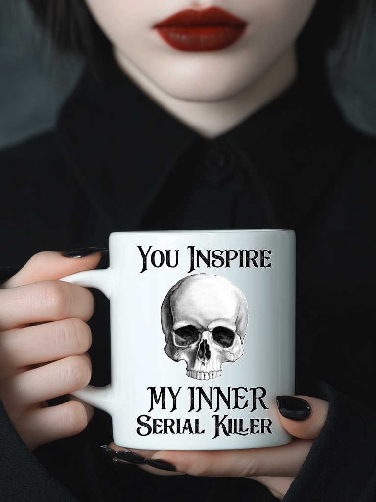 Mugg i vitt med en dödskalle och texten ’You inspire my inner serial killer’ som tryck på båda sidorna. Muggen är tillverkad i keramik och tål både maskindisk och uppvärmning i mikro.