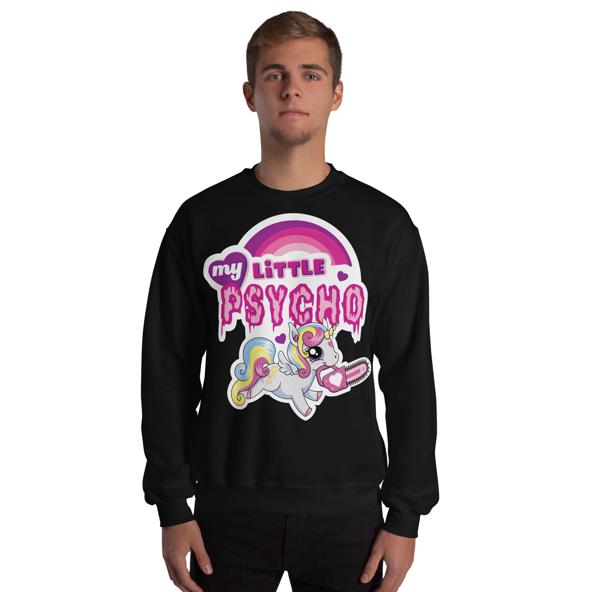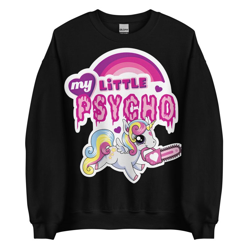 Varm och skön sweatshirt i svart tillverkad i blandad bomull/polyester med en söt enhörning med en motorsåg och texten ’My little psycho’ som dekoration på framsidan. Tröjan passar perfekt till både män och kvinnor som älskar alternativa kläder.