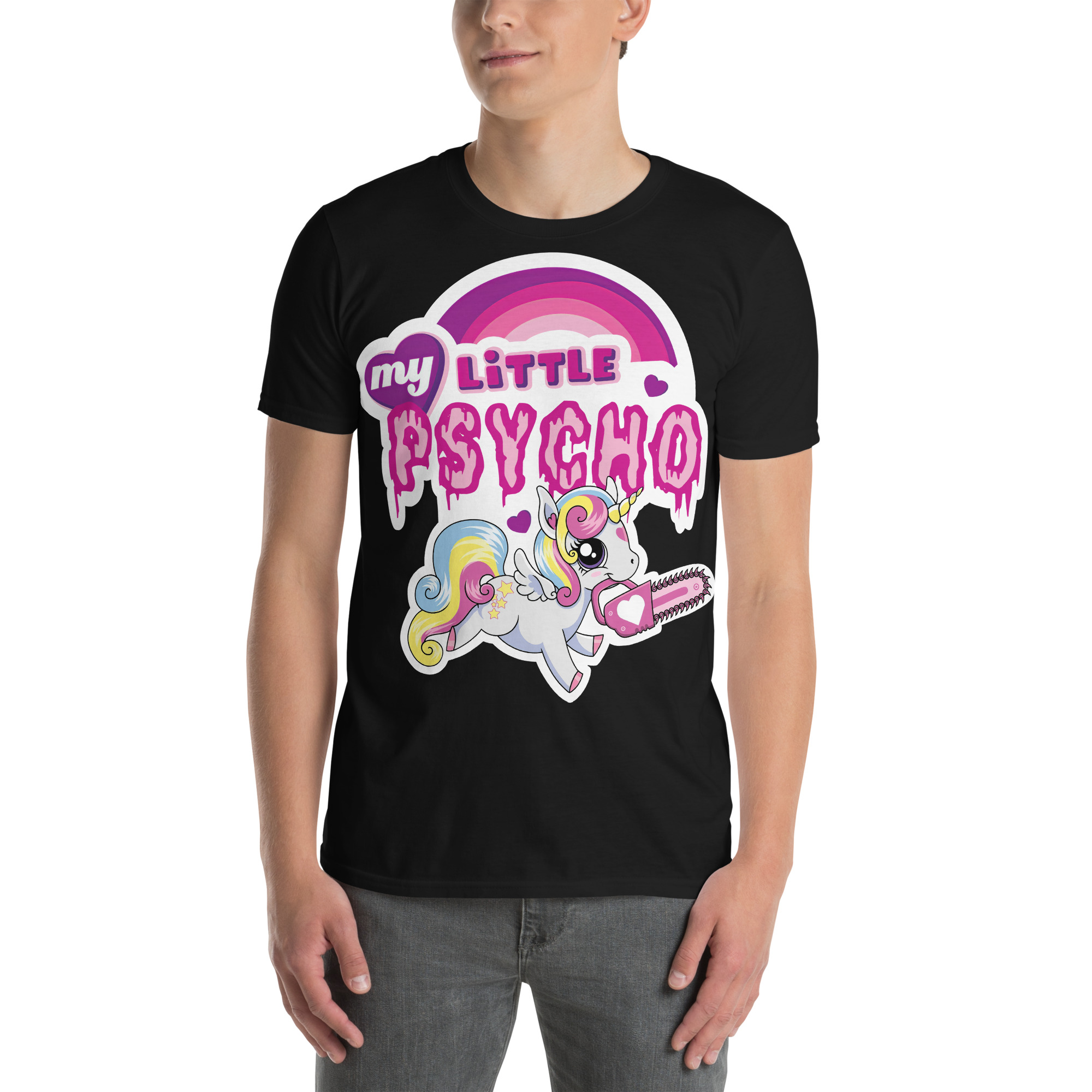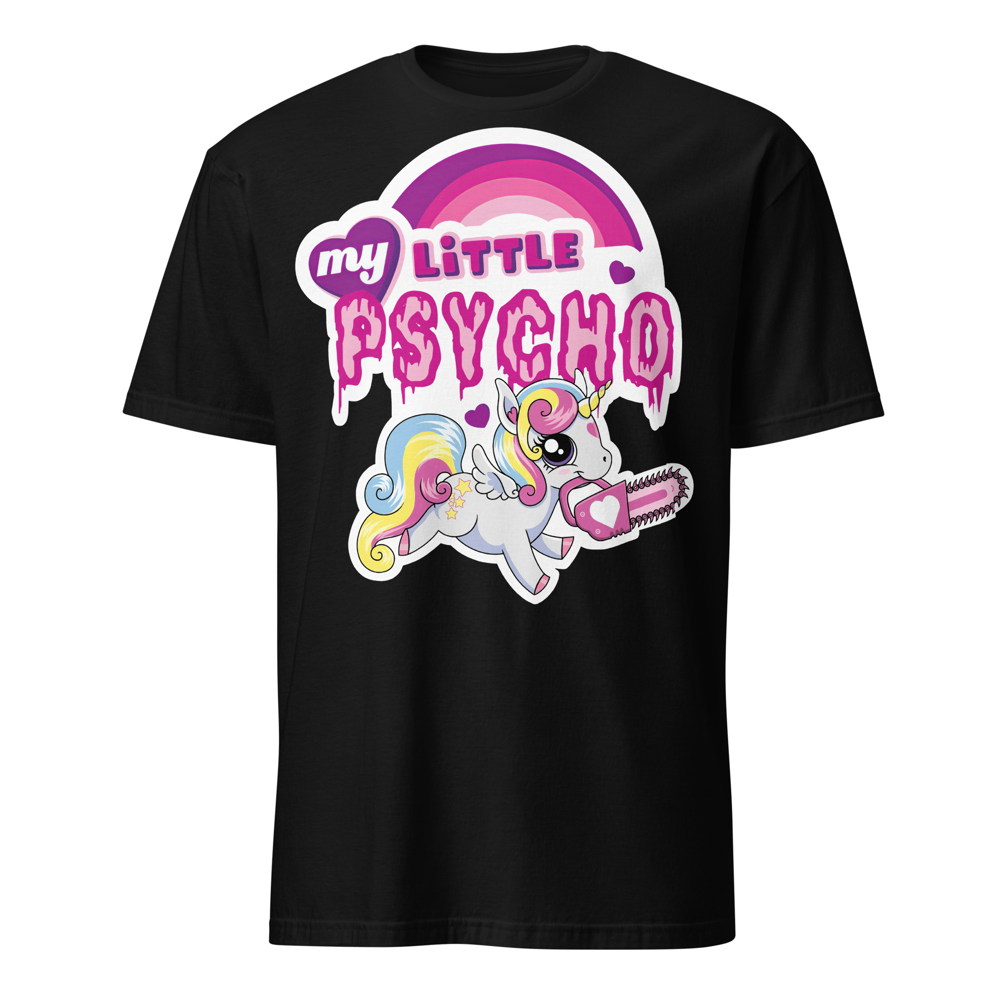 T-shirt i svart med en söt enhörning med en motorsåg och texten ’My little psycho’ som dekoration på framsidan. Passar perfekt till kvinnor och män som älskar alternativa kläder. Tröjan är tillverkad i en supermjuk kvalitet i 100% bomull.