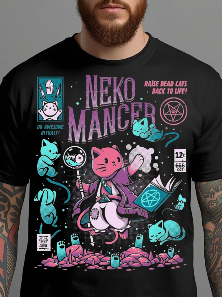 T-shirt i svart med en magisk katt och texten ’Nekomancer’ som dekoration på framsidan. Passar perfekt till både män och kvinnor som älskar alternativa kläder. Tröjan är tillverkad i en fin kvalitet i 100% bomull.