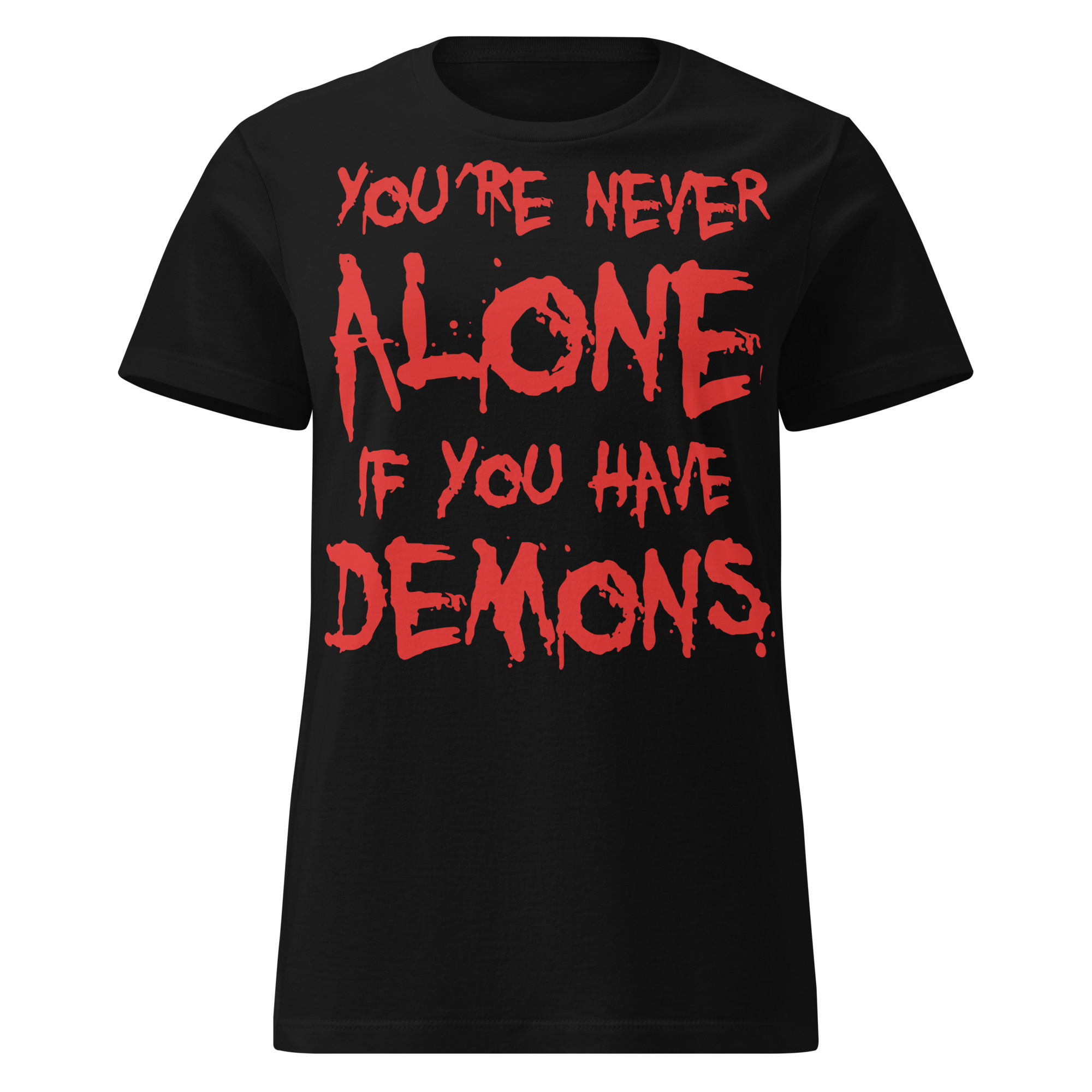 Semi-fitted t-shirt i svart med texten ’You’re never alone if you have demons’ som dekoration på framsidan. Passar perfekt till kvinnor som älskar den alternativa klädstilen. Tröjan är tillverkad i en supermjuk kvalitet i 100% bomull.