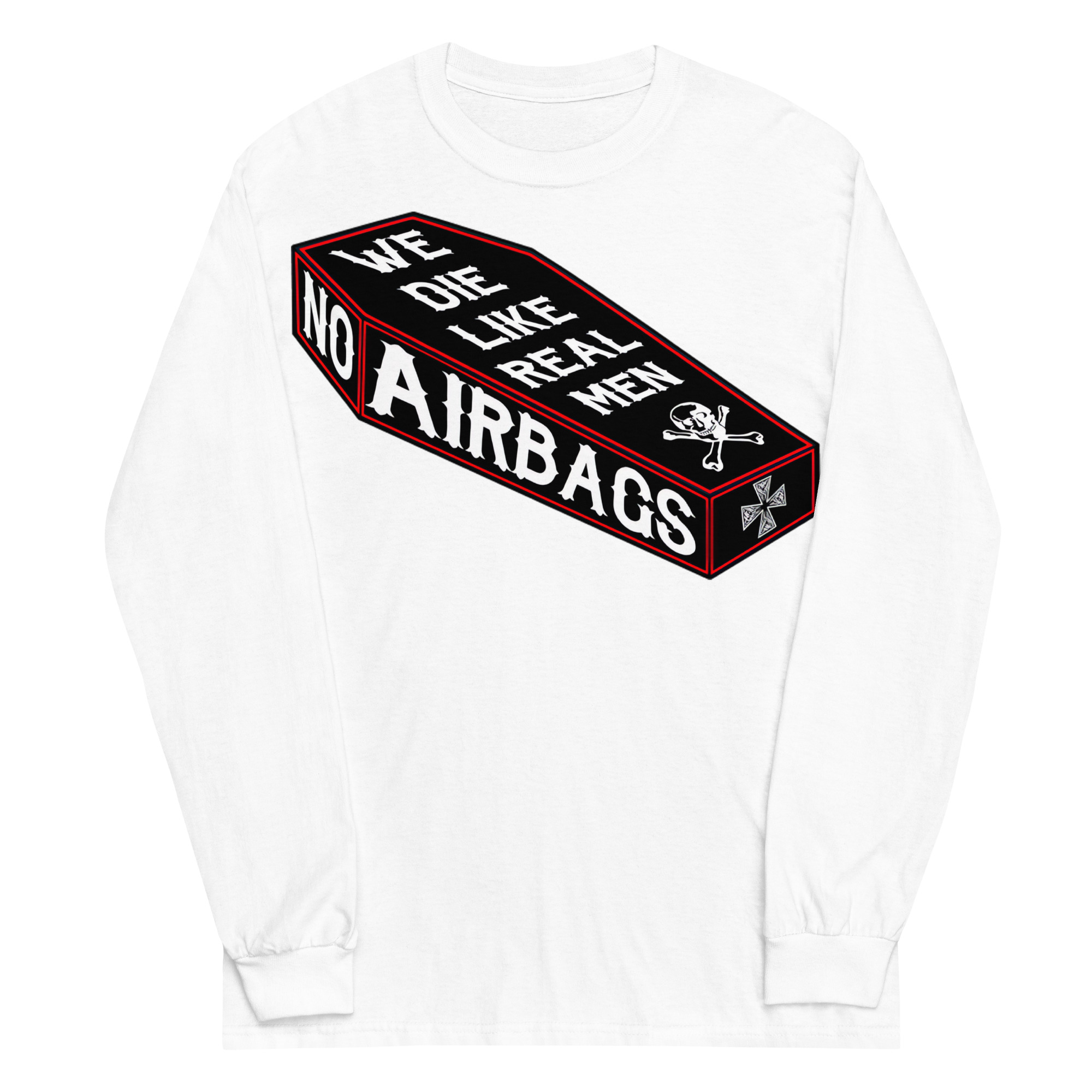 Långärmad tröja i en tunnare skön kvalitet med en kista med texten ’No airbags – we die like real men’ som dekoration på framsidan. Tillverkad i 100% bomull och passar alla oss som älskar att köra gamla bilar.