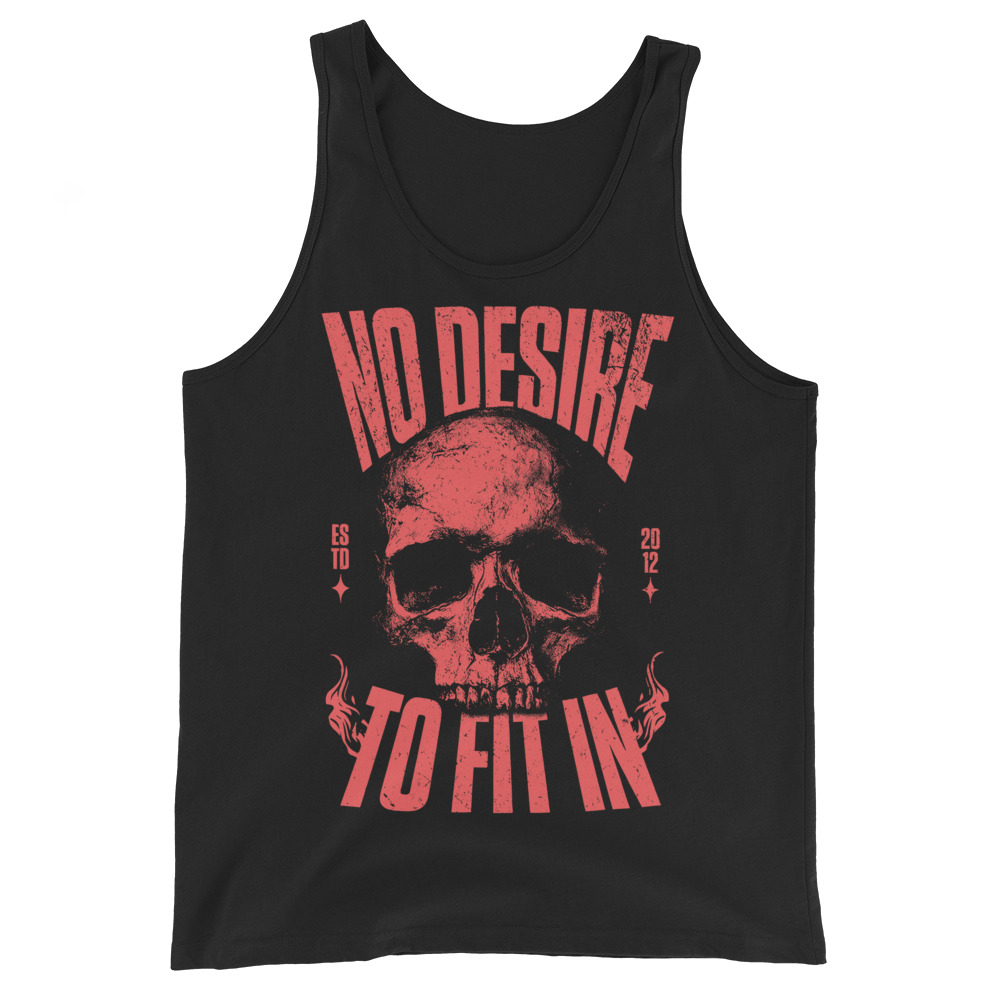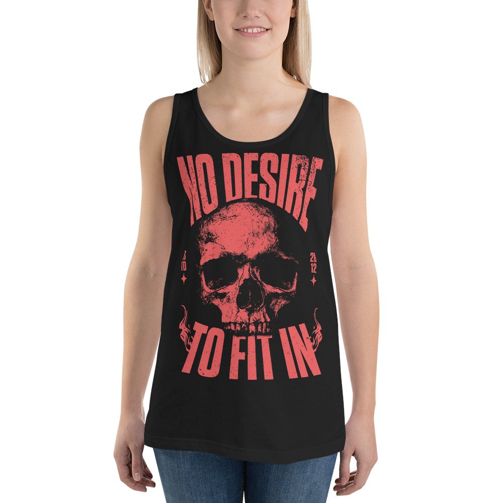 Linne i svart med en stor dödskalle och texten ’No desire to fit in’ som tryck på framsidan. Tillverkad i en skön kvalitet i 100% bomull. Passar perfekt till både män och kvinnor som älskar den alternativa stilen.