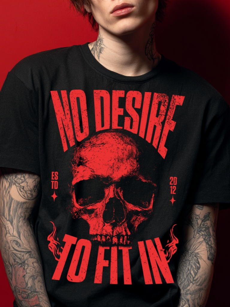 T-shirt i svart med en stor dödskalle och texten ’No desire to fit in’ som dekoration på framsidan. Passar perfekt till kvinnor och män som älskar den alternativa klädstilen. Tröjan är tillverkad i en supermjuk kvalitet i 100% bomull.