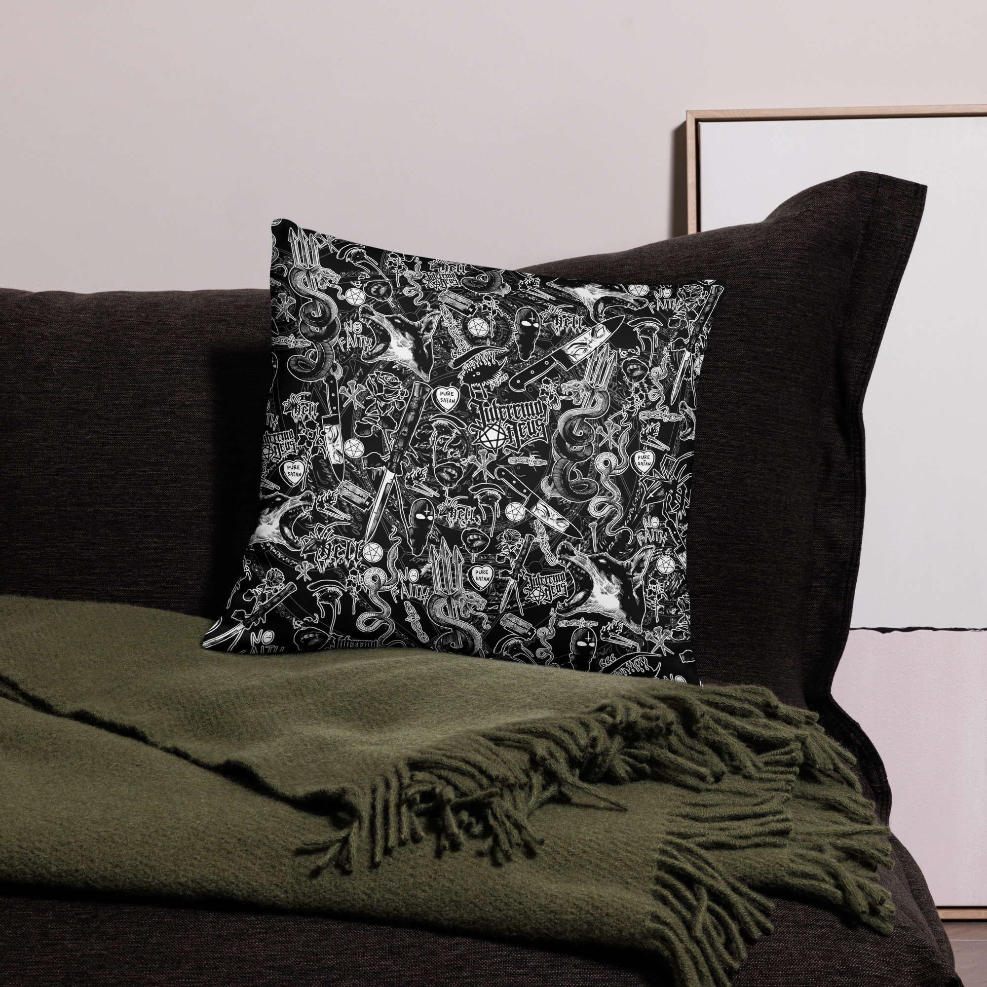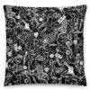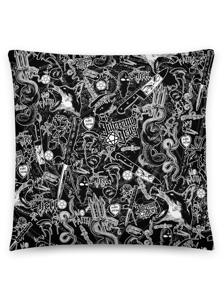 Riktigt snygg prydnadskudde med ett detaljrikt tryck med flera satanistiska motiv som dekoration. Kudden är 45×45 cm och har tryck på båda sidorna. Tillverkad i polyester i en fin kvalitet. Överdraget kan tvättas i maskin och innehållet kan tvättas för hand. Kudden har en gömd dragkedja så överdraget lätt kan tas av.