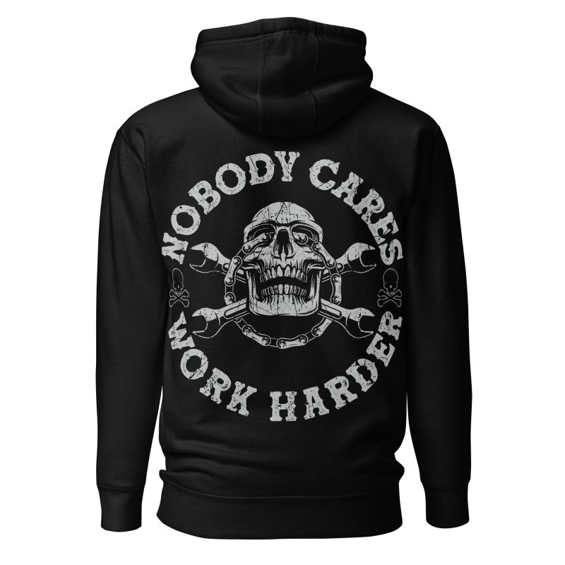 Hoodie i unisex-modell tillverkad i en extra fin kvalitet i blandad bomull och polyester. På baksidan återfinns en stor dödskalle med korsade skiftnycklar och texten ’Nobody cares, work harder’ som dekoration. Hoodien håller värmen riktigt bra och har ett otroligt mjukt tyg. Passar alla oss som älskar alternativa kläder.
