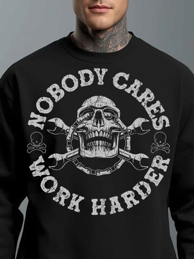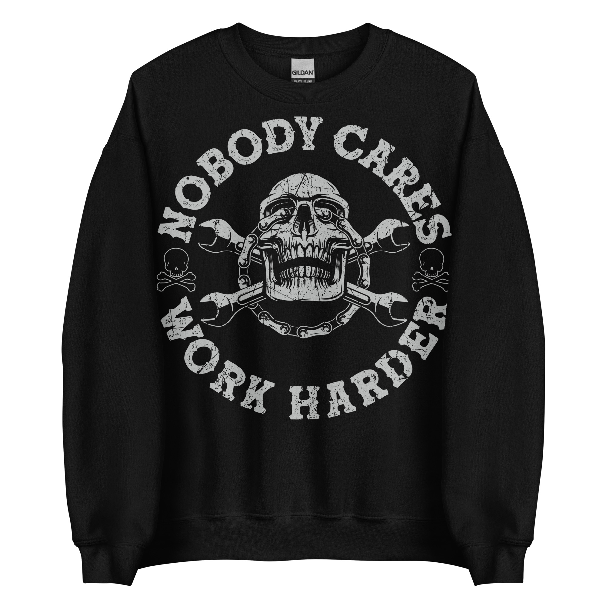 Varm och skön sweatshirt i svart tillverkad i blandad bomull/polyester med en stor dödskalle med korsade skiftnycklar och texten ’Nobody cares, work harder’ som dekoration på framsidan. Tröjan passar perfekt till alla hårt arbetande män och kvinnor.