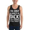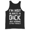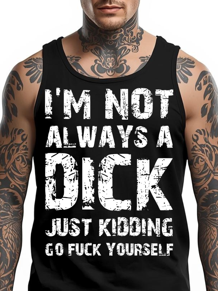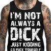 Linne i svart med texten ’I’m not always a dick, just kidding, go fuck yourself’ som tryck på framsidan. Tillverkad i en skön kvalitet i 100% bomull. Passar perfekt till både män och kvinnor som älskar attityd.