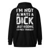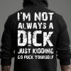 Hoodie med dragkedja och ett stort ryggtryck med texten ’I’m not always a dick, just kidding, go fuck yourself’. Passar perfekt till både män och kvinnor, materialet är blandad bomull och polyester.