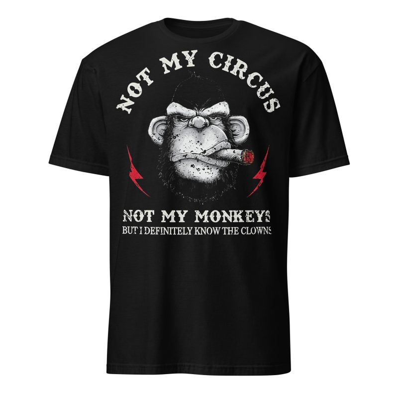 T-shirt i svart med en apa som röker en cigarett och texten ’Not my circus, not my monkeys, but I definitely know the clowns’ som dekoration på framsidan. Passar perfekt till kvinnor och män som älskar den alternativa klädstilen. Tröjan är tillverkad i en supermjuk kvalitet i 100% bomull.