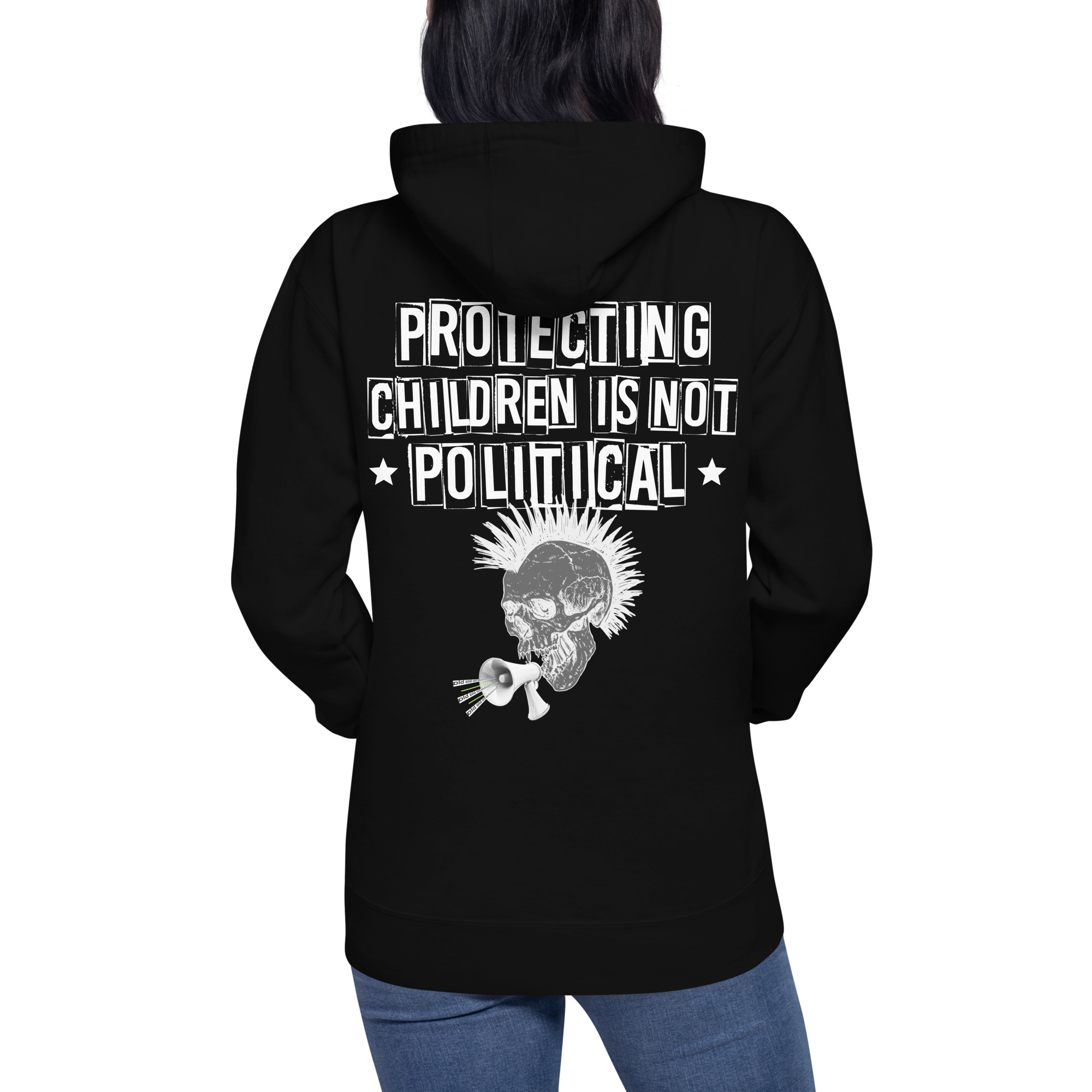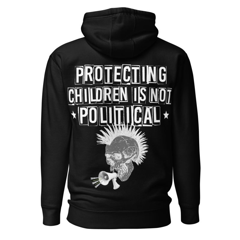 Hoodie i unisex-modell tillverkad i en extra fin kvalitet i blandad bomull och polyester. På baksidan återfinns en döskalle och texten ’Protecting children is not political’ som dekoration. Hoodien håller värmen riktigt bra och har ett otroligt mjukt tyg. Passar alla oss som älskar alternativa kläder.