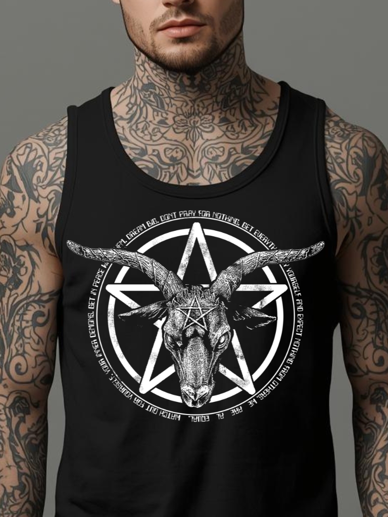 Linne i svart med ett stort pentagram med ett bockhuvud som tryck på framsidan. Tillverkad i en skön kvalitet i 100% bomull. Passar perfekt till både män och kvinnor.
