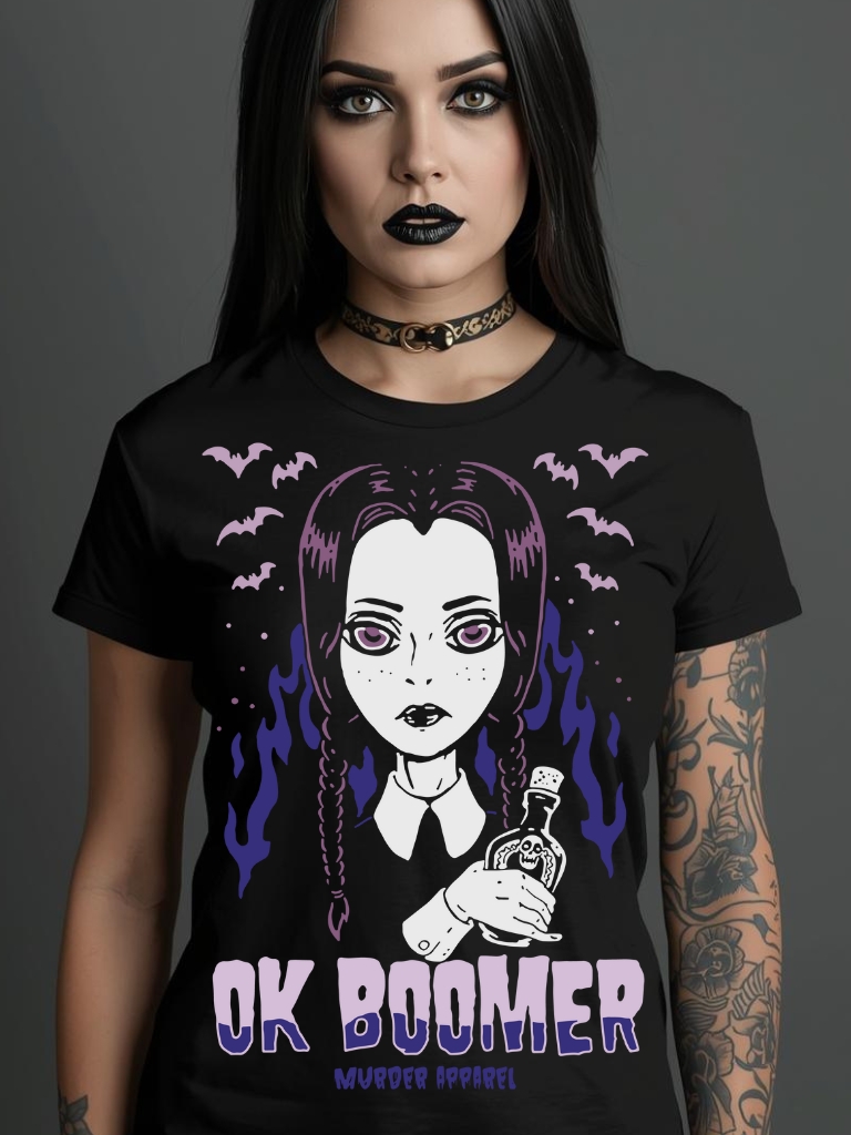 Semi-fitted t-shirt i svart med Wednesday Addams och texten ’Ok boomer’ som dekoration på framsidan. Passar perfekt till kvinnor som älskar den alternativa stilen. Tröjan är tillverkad i en supermjuk kvalitet i 100% bomull.