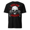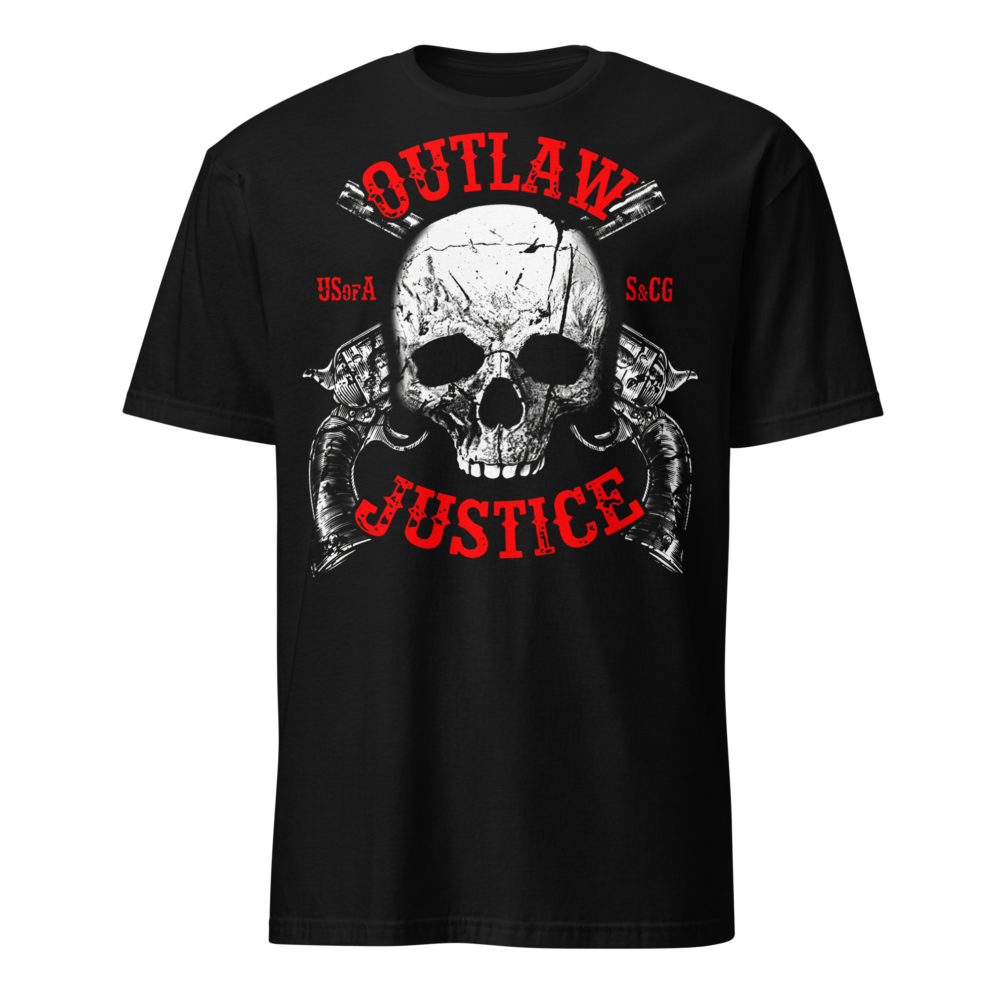 Snygg t-shirt i svart med en dödskalle, två pistoler och texten ’Outlaw justice’ som dekoration på framsidan. Passar perfekt till både män och kvinnor och är tillverkad i en supermjuk kvalitet i 100% bomull.