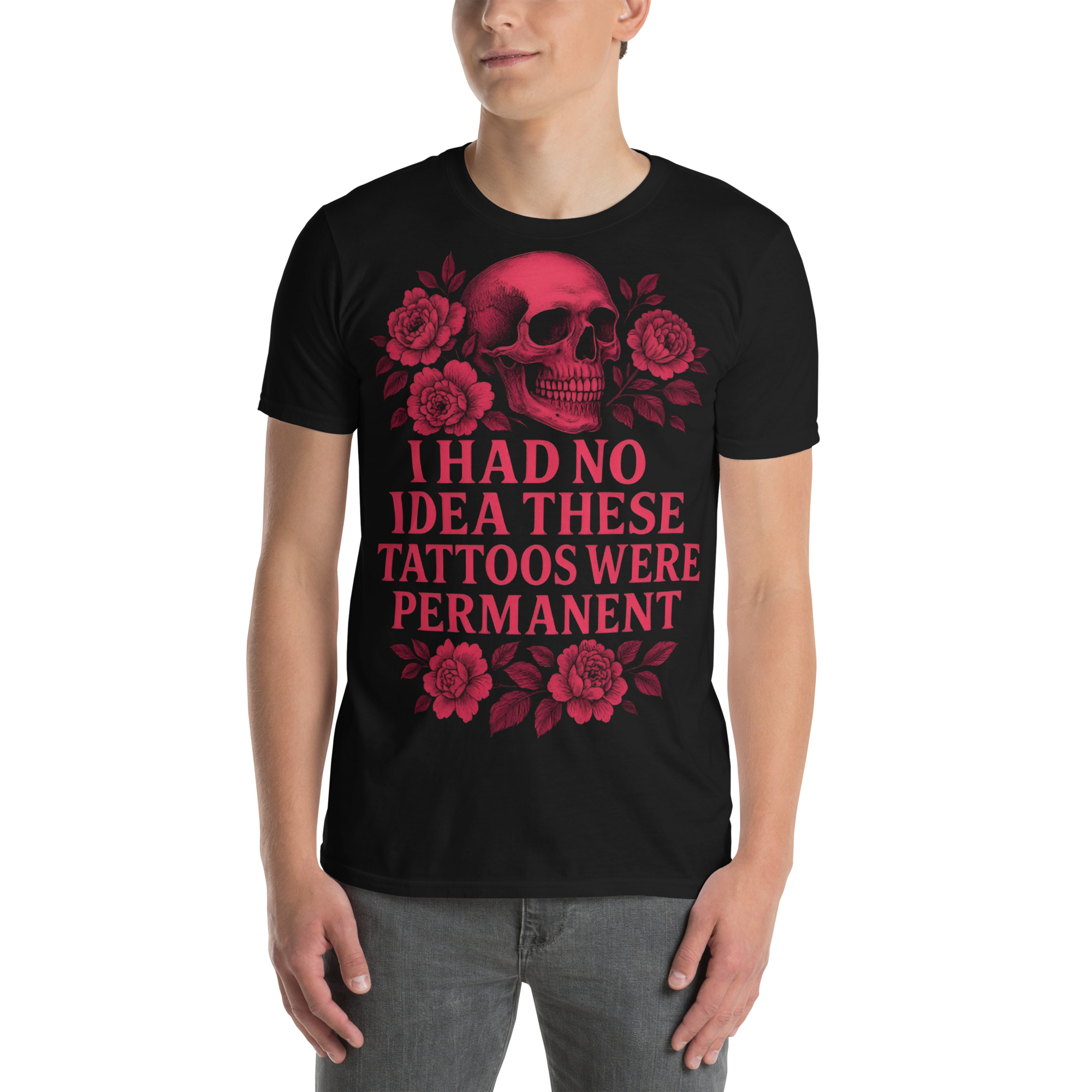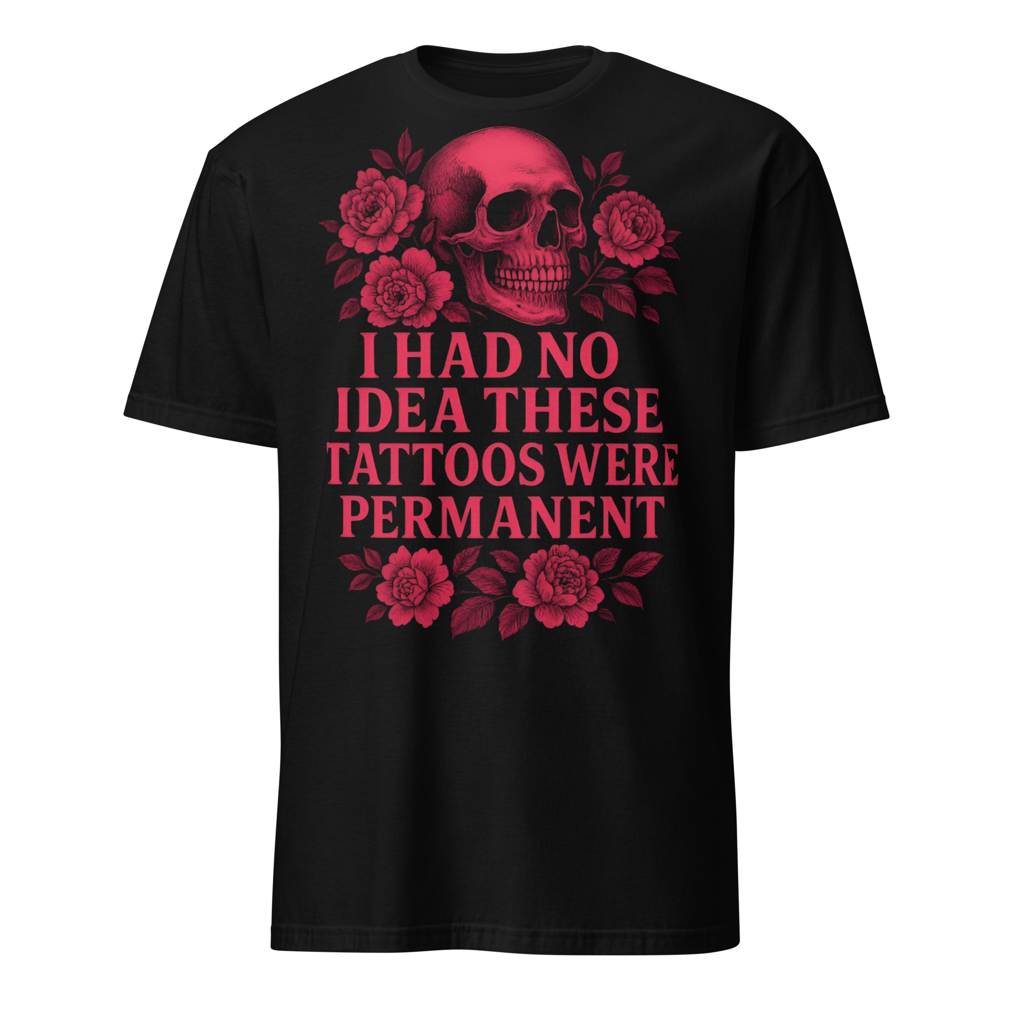 T-shirt i svart med en dödskalle, rosor och texten ’I had no idea these tattoos were permanent’ som dekoration på framsidan. Passar perfekt till kvinnor och män som älskar den alternativa klädstilen. Tröjan är tillverkad i en supermjuk kvalitet i 100% bomull.