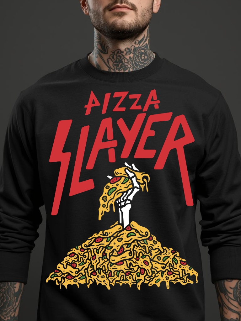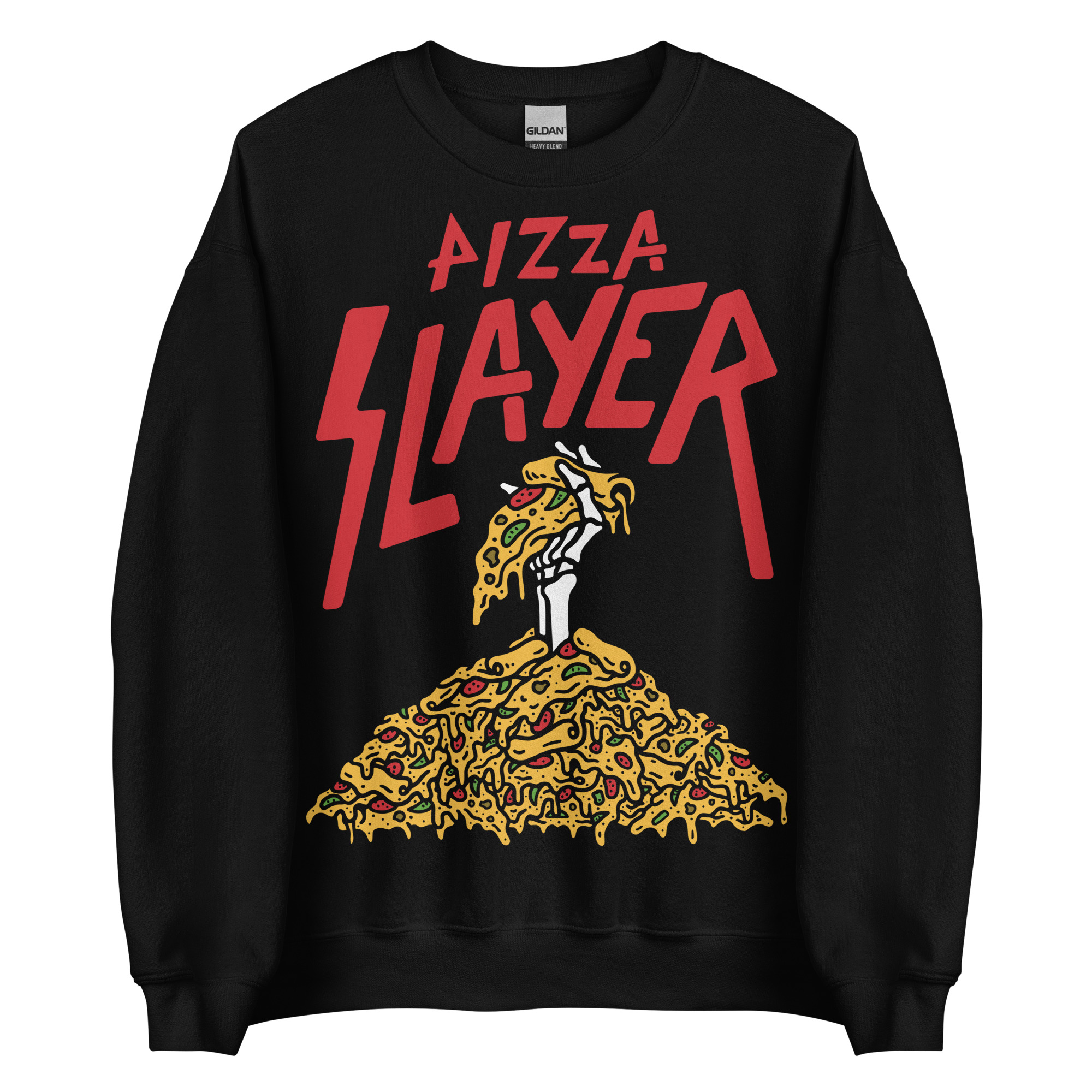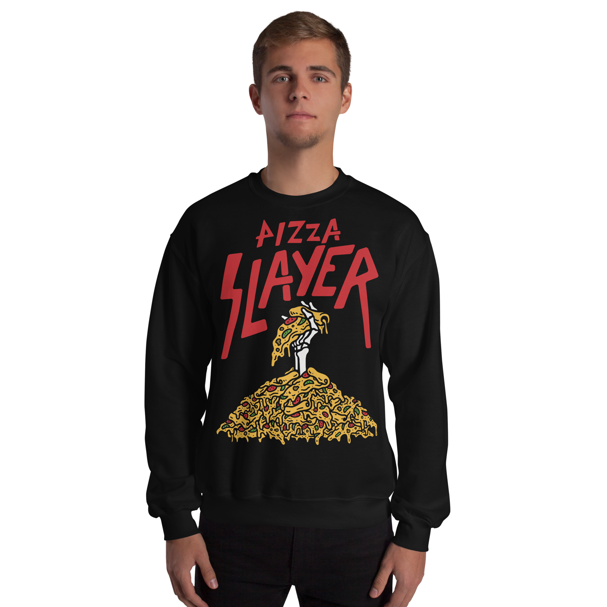 Varm och skön sweatshirt i svart tillverkad i blandad bomull/polyester med en skeletthand som håller upp en pizza-slice och texten ’Pizza slayer’ som dekoration på framsidan. Tröjan passar perfekt till både män och kvinnor som älskar alternativa kläder.
