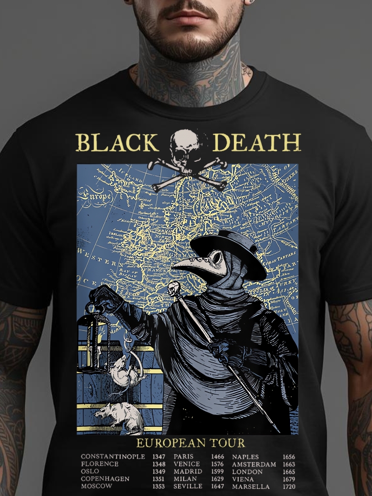 T-shirt i svart med ett alternativt tryck med texten ’Black death european tour’ som dekoration på framsidan. Passar perfekt till både män och kvinnor som älskar den alternativa klädstilen. Tröjan är tillverkad i en supermjuk kvalitet i 100% bomull.