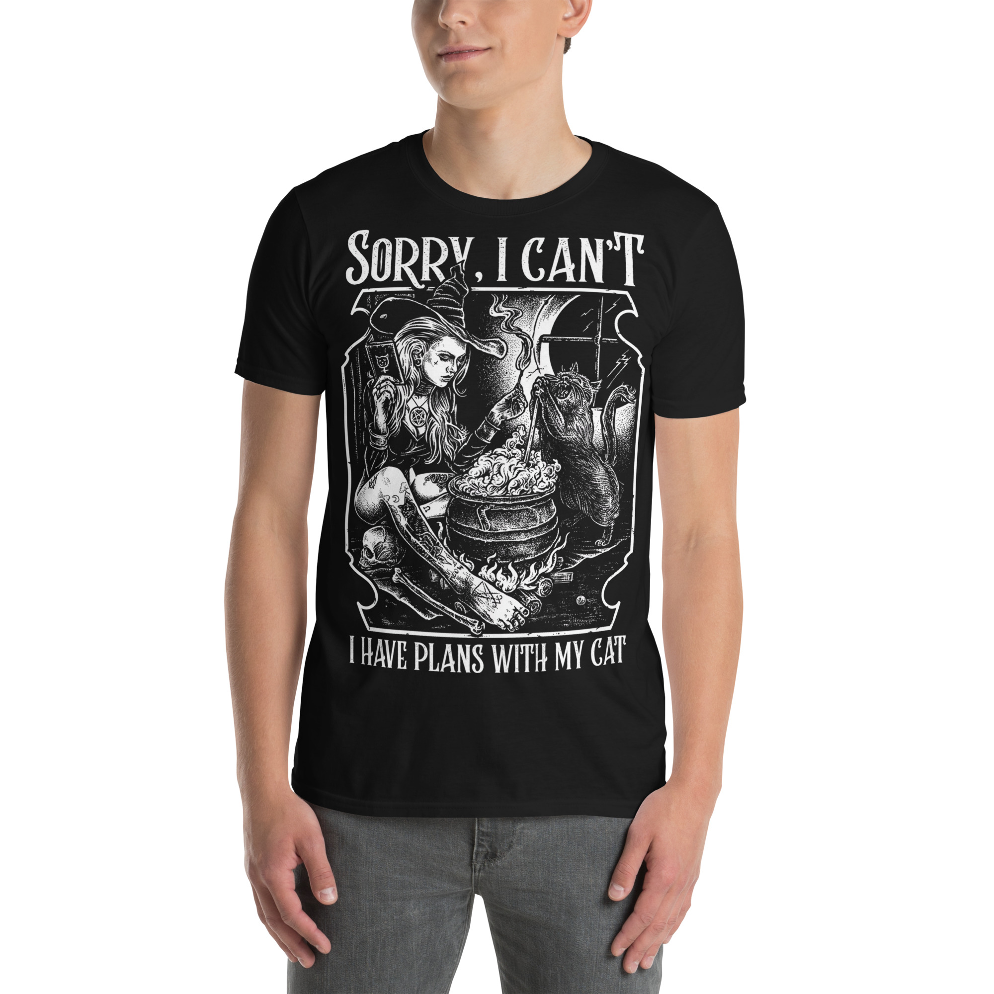 T-shirt i svart med en häxa med sin katt och texten ’Sorry I can’t, I have plans with my cat’ som dekoration på framsidan. Passar perfekt till kvinnor och män som älskar alternativa kläder. Tröjan är tillverkad i en supermjuk kvalitet i 100% bomull.