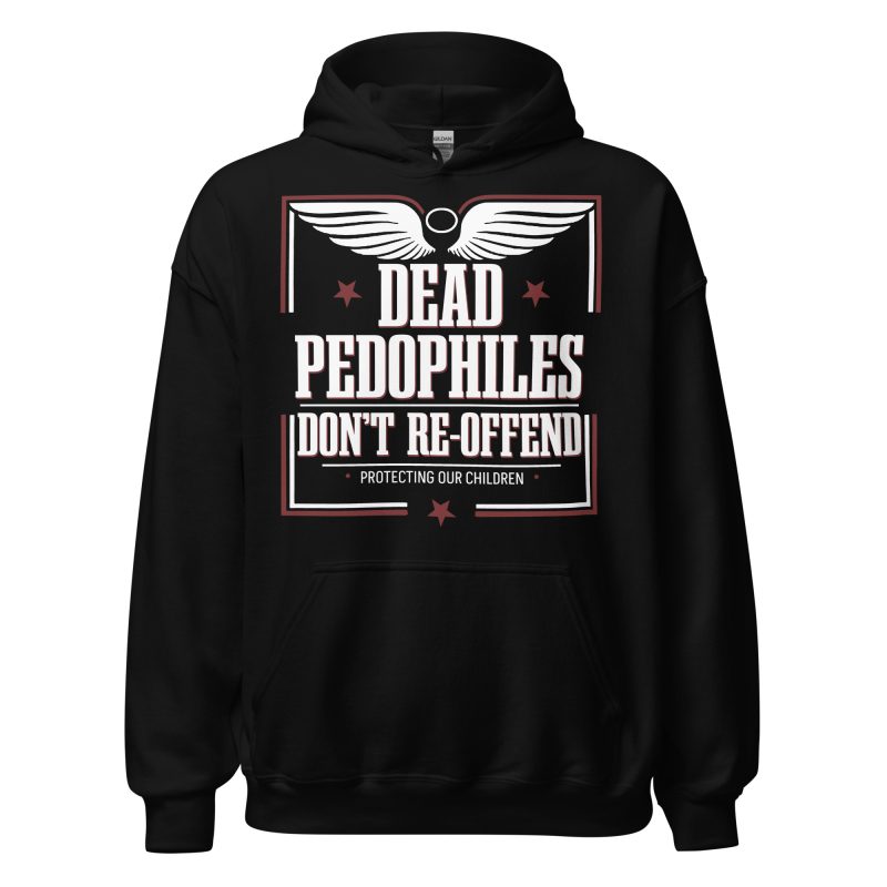 Hoodie i unisex-modell tillverkad i en fin kvalitet i blandad bomull och polyester. På framsidan återfinns budskapet ’Dead pedophiles don’t re-offend’ som dekoration. Hoodien håller värmen riktigt bra och har ett otroligt mjukt tyg.