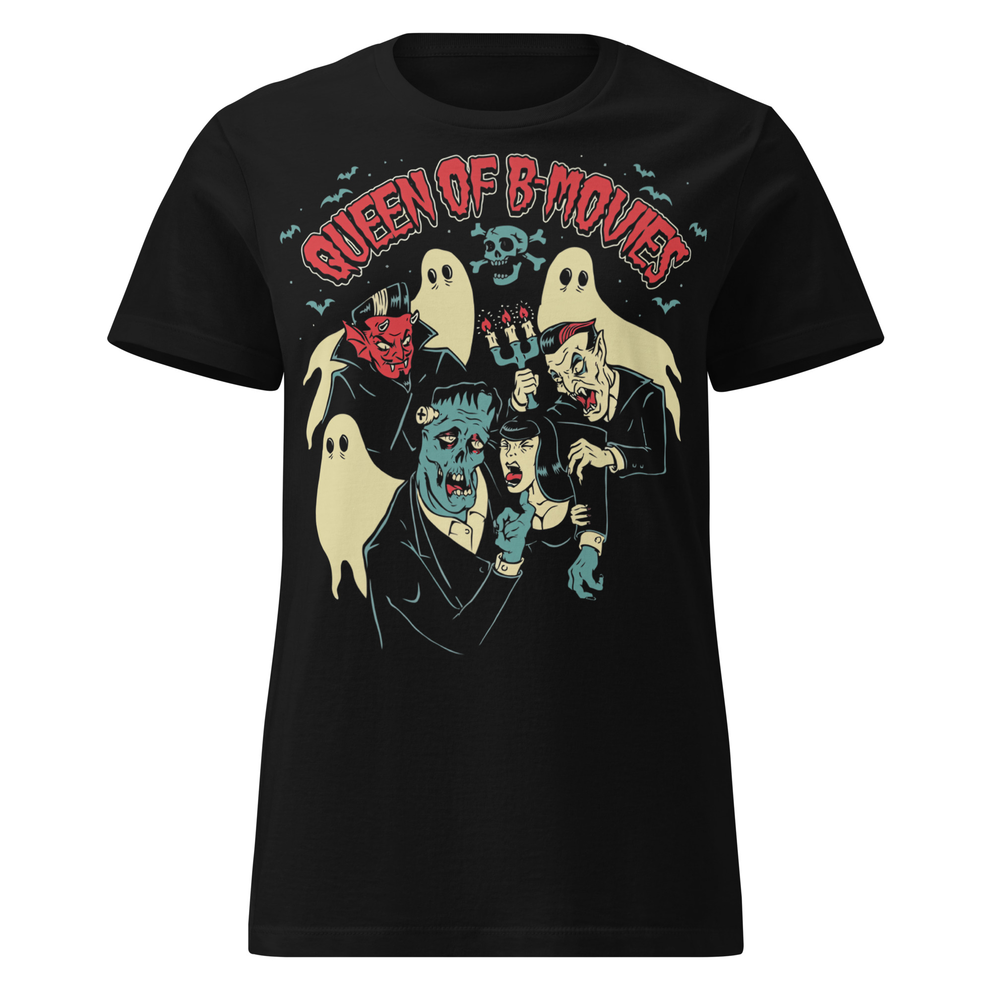 Semi-fitted t-shirt i svart med ett gäng läskiga varelser och texten ’Queen of b-movies’ som dekoration på framsidan. Passar perfekt till kvinnor som älskar psychobilly-stilen. Tröjan är tillverkad i en supermjuk kvalitet i 100% bomull.