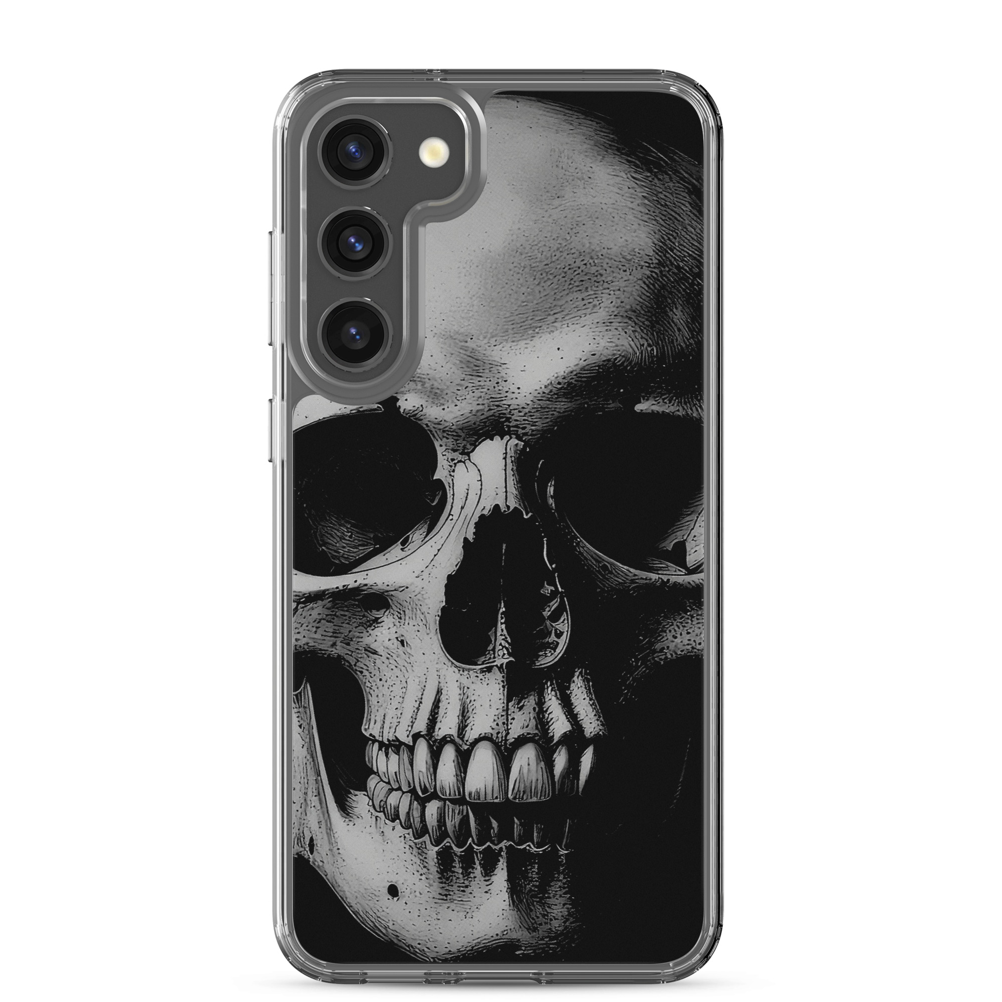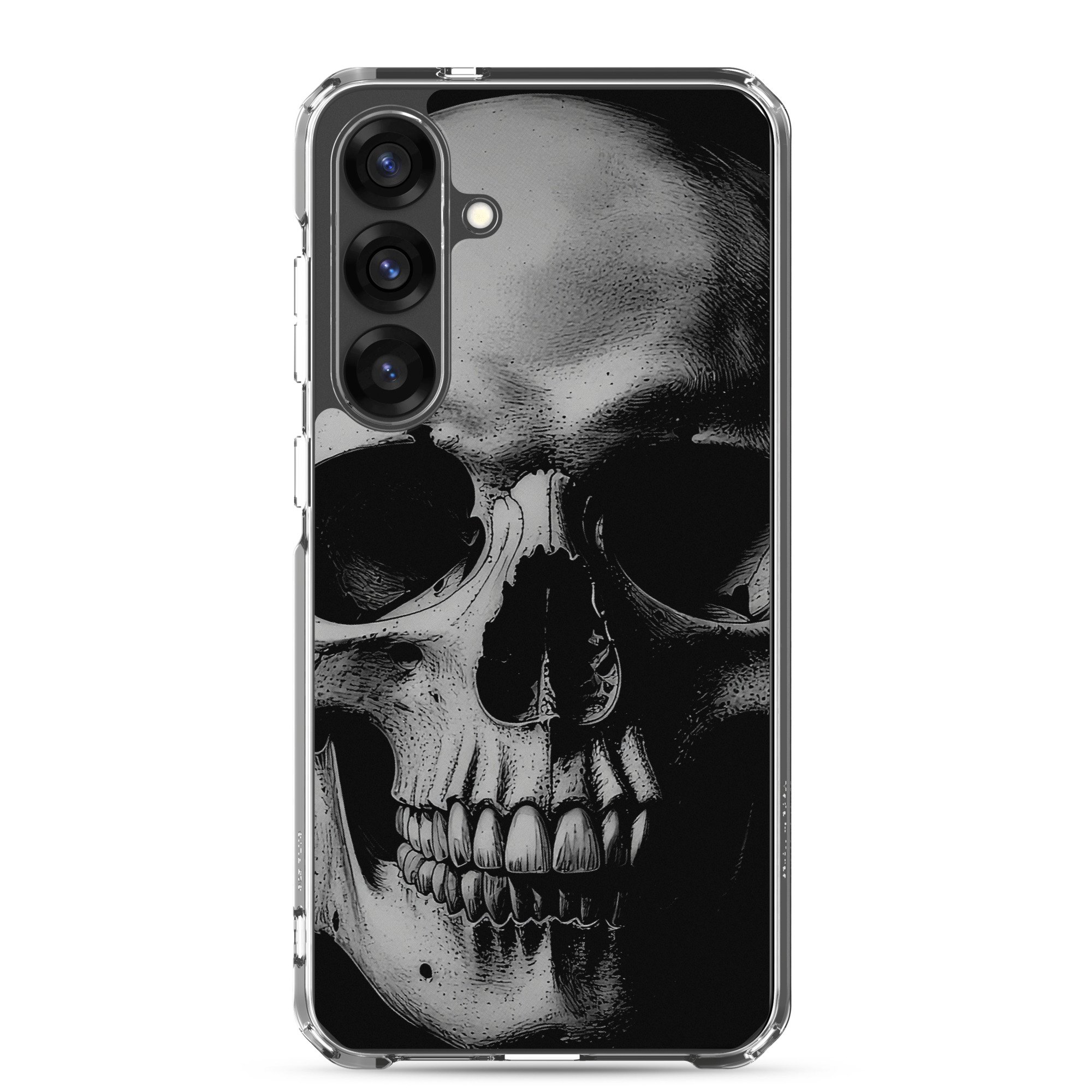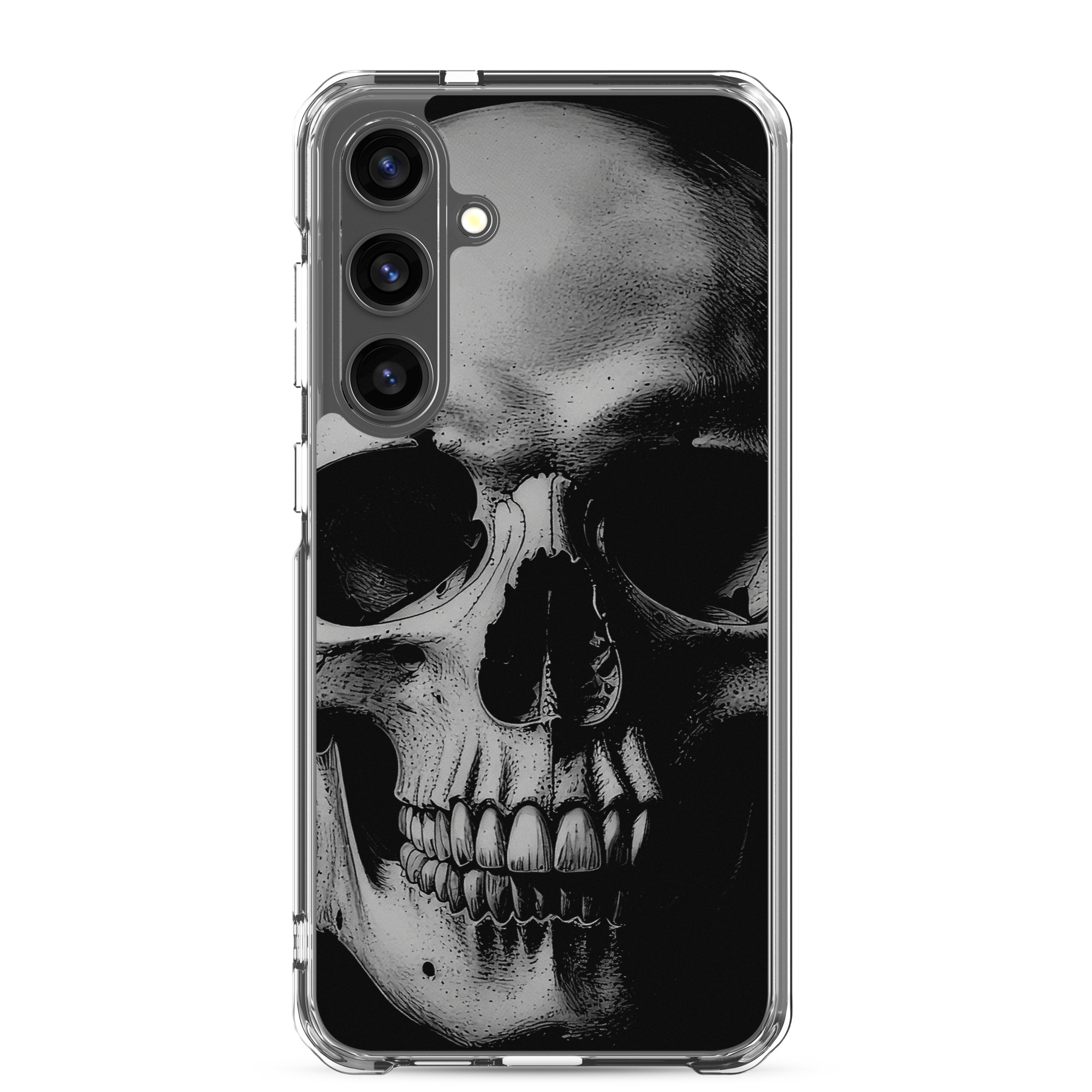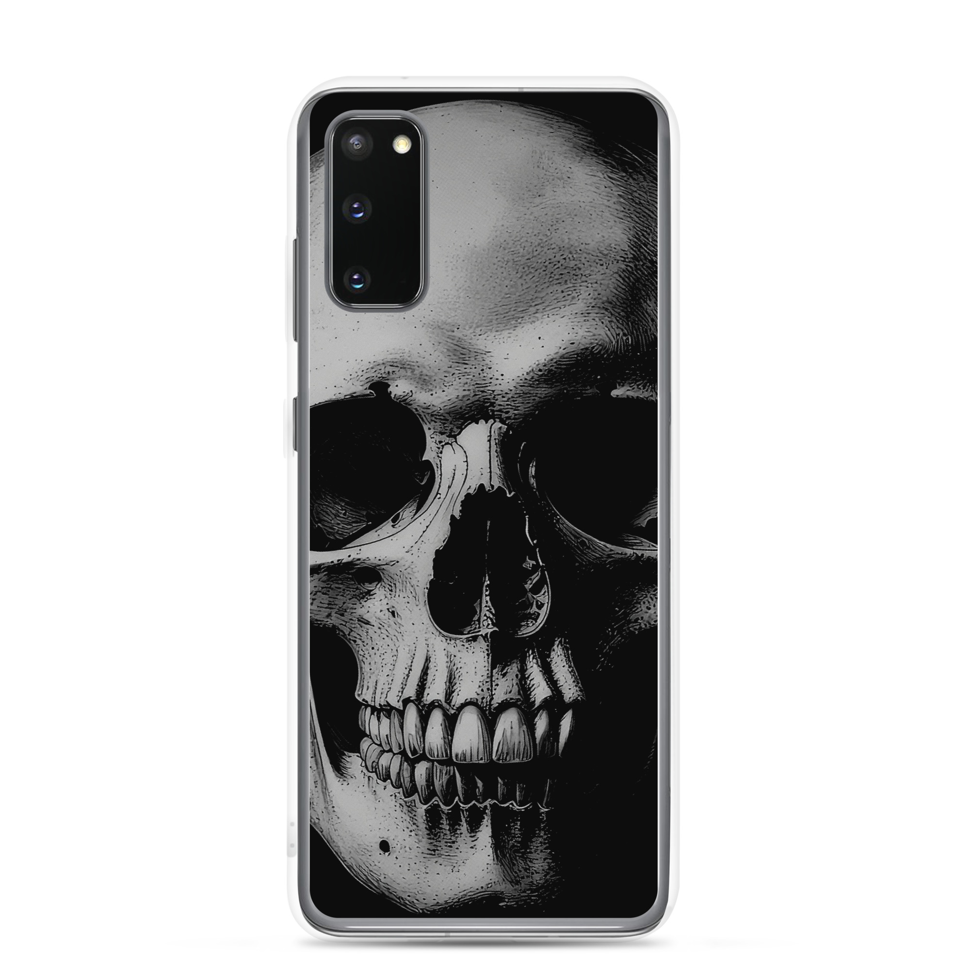 Mobilskal som passar Samsung Galaxy-modellerna med en stor realistisk dödskalle som dekoration. Tillverkad i hög kvalitet och skyddar baksidan och sidorna på din telefon mot repor, smuts, olja och damm. Sidorna är genomskinliga och har färdiga hål för laddning, volym, hörlurar och på/avstängning. Skalet är väldigt slitstarkt och enkelt att ta av telefonen på grund av det följsamma materialet runtom. Kompatibla för trådlös laddning.