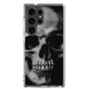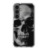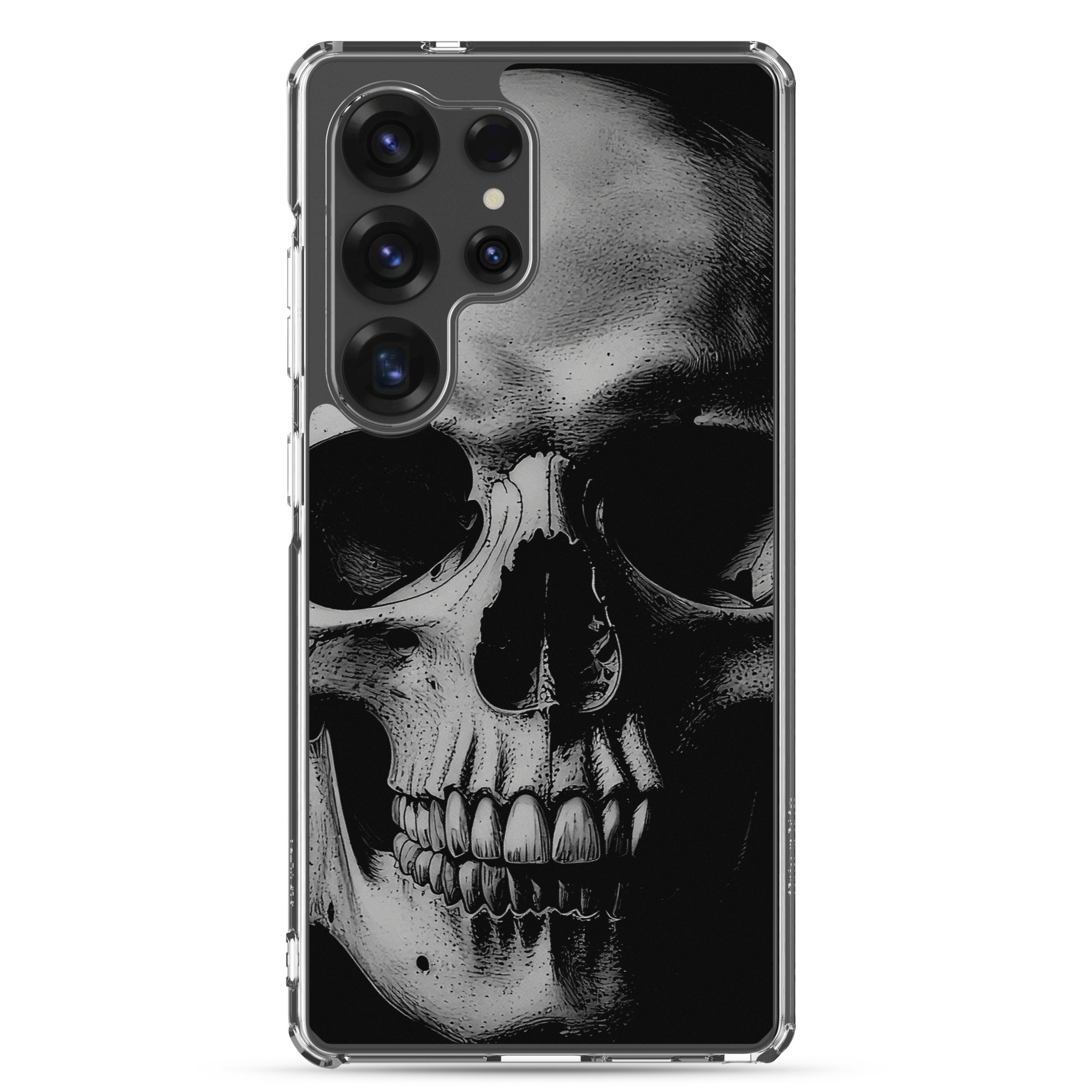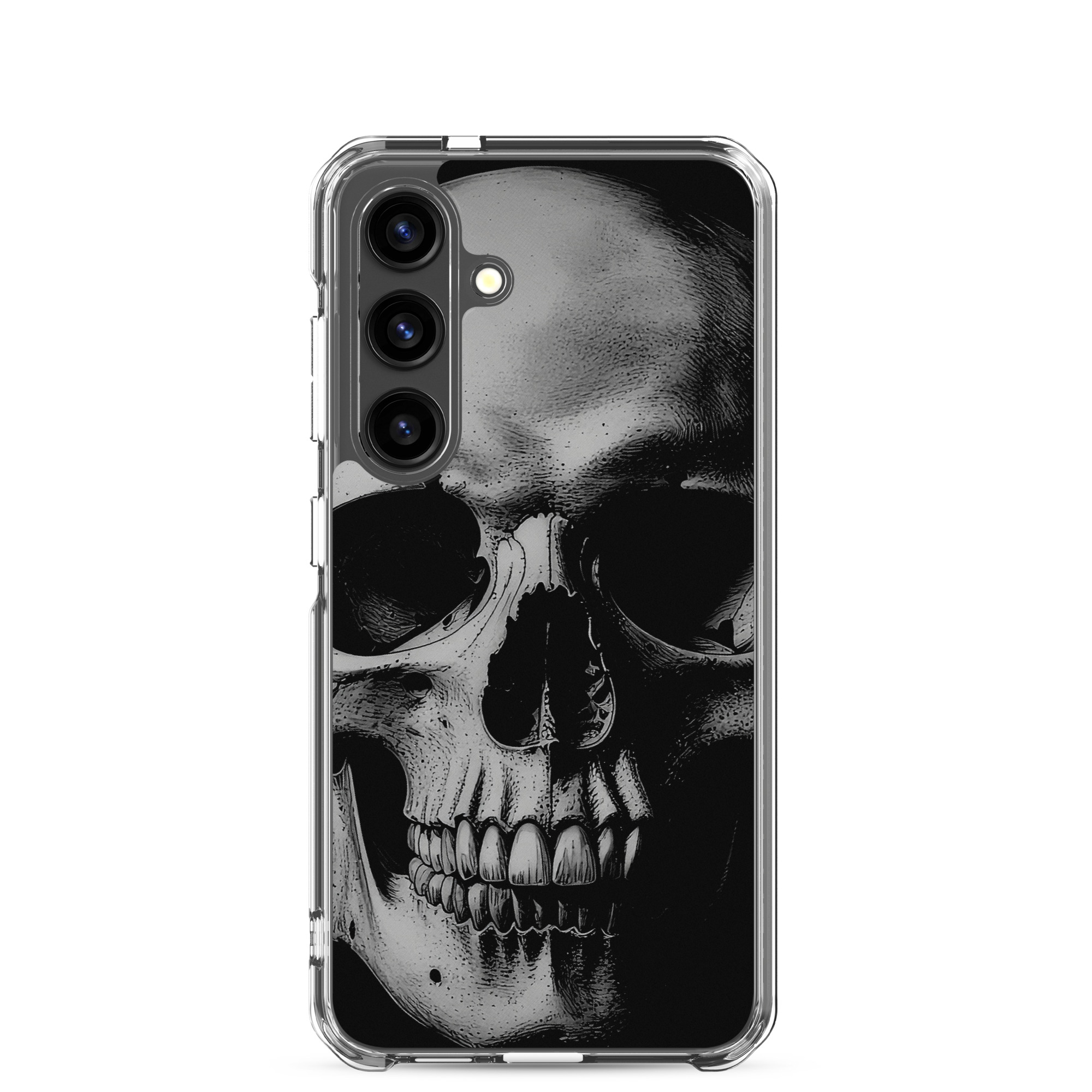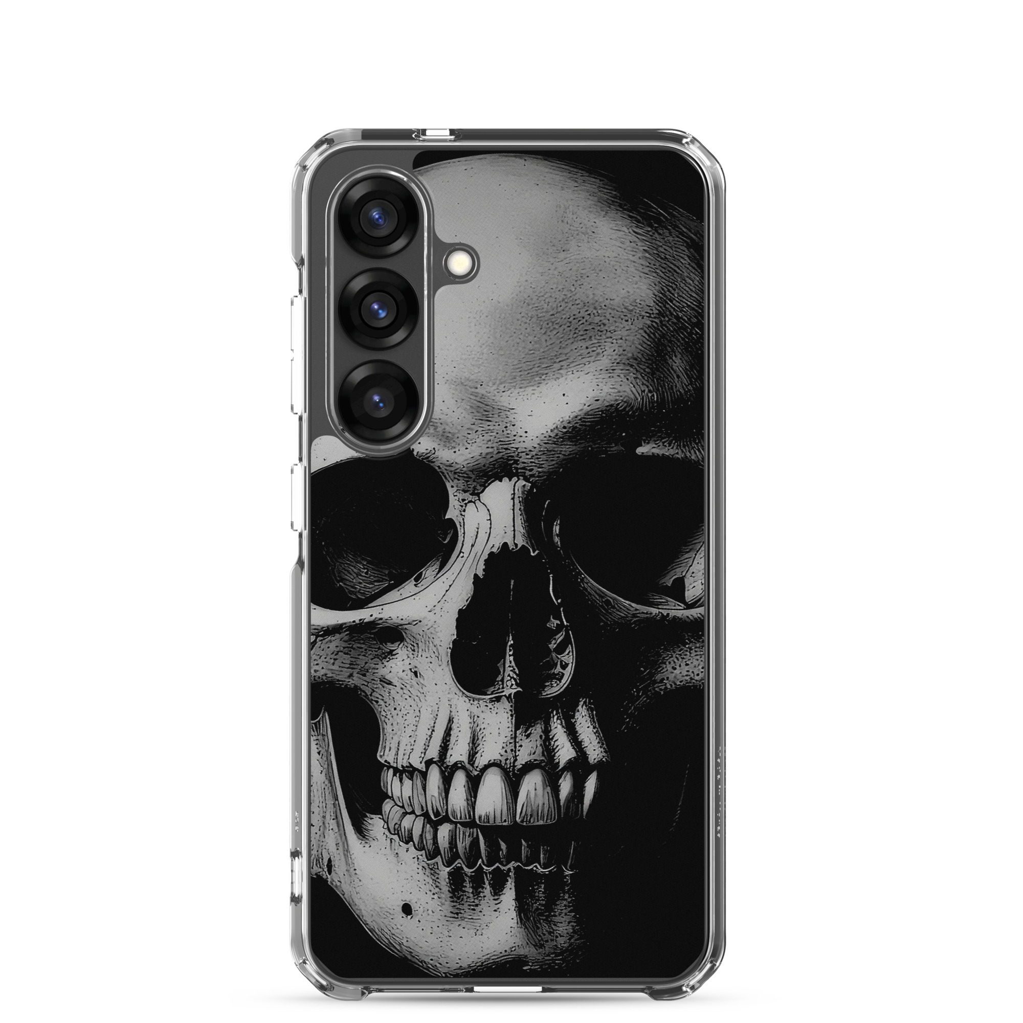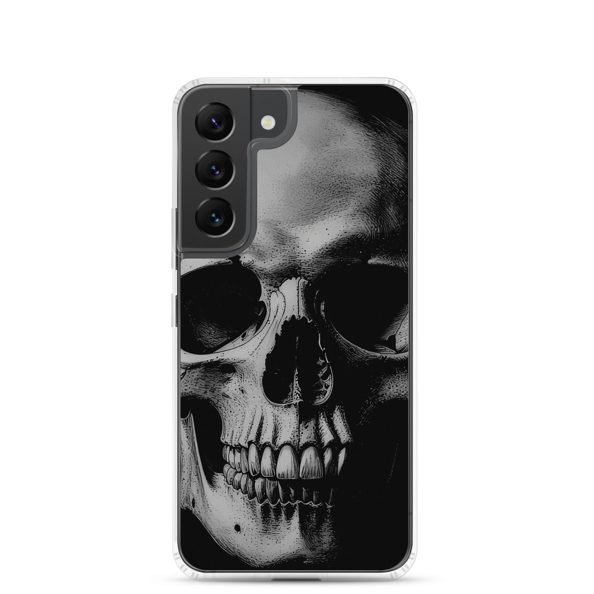 Mobilskal som passar Samsung Galaxy-modellerna med en stor realistisk dödskalle som dekoration. Tillverkad i hög kvalitet och skyddar baksidan och sidorna på din telefon mot repor, smuts, olja och damm. Sidorna är genomskinliga och har färdiga hål för laddning, volym, hörlurar och på/avstängning. Skalet är väldigt slitstarkt och enkelt att ta av telefonen på grund av det följsamma materialet runtom. Kompatibla för trådlös laddning.