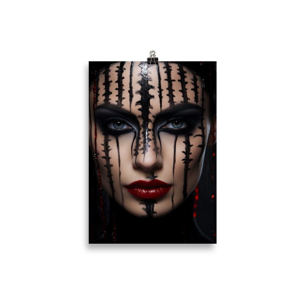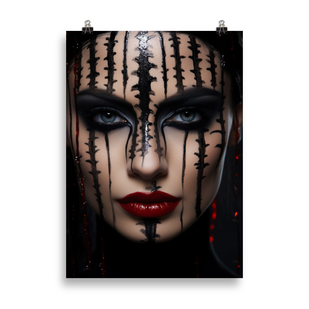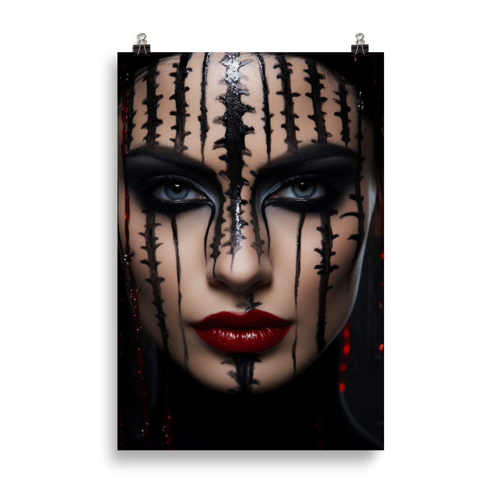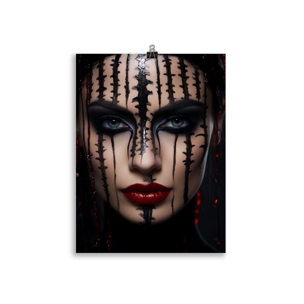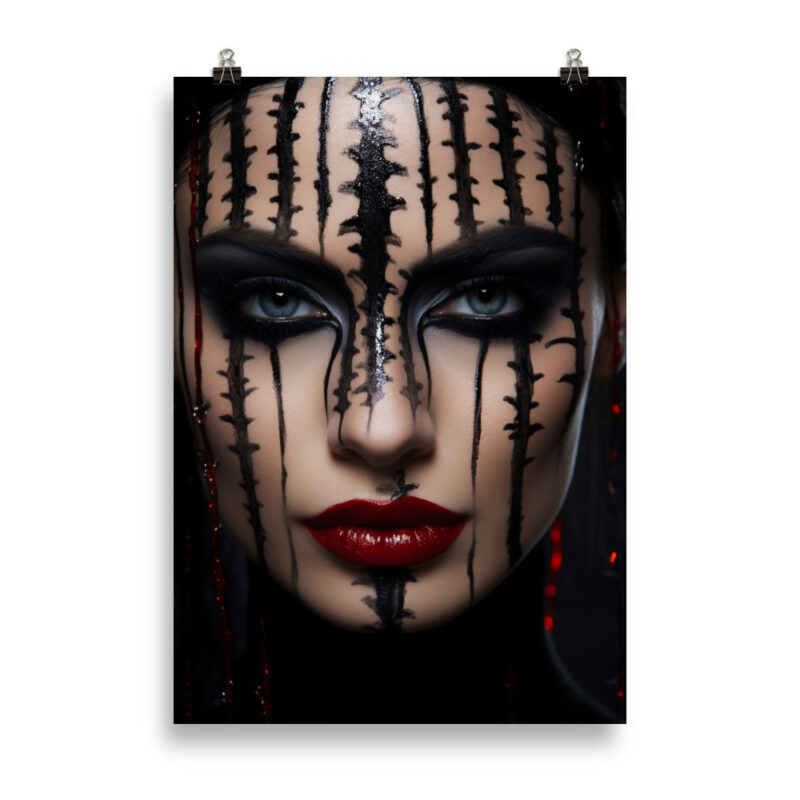 Poster tillverkad i ett tjockt kvalitetspapper med ett vackert målat ansikte med röda läppar som dekoration. Välj mellan att rama in detta konstverk eller häng upp den som den är. Denna poster kommer ge en mörk twist till ditt hem.