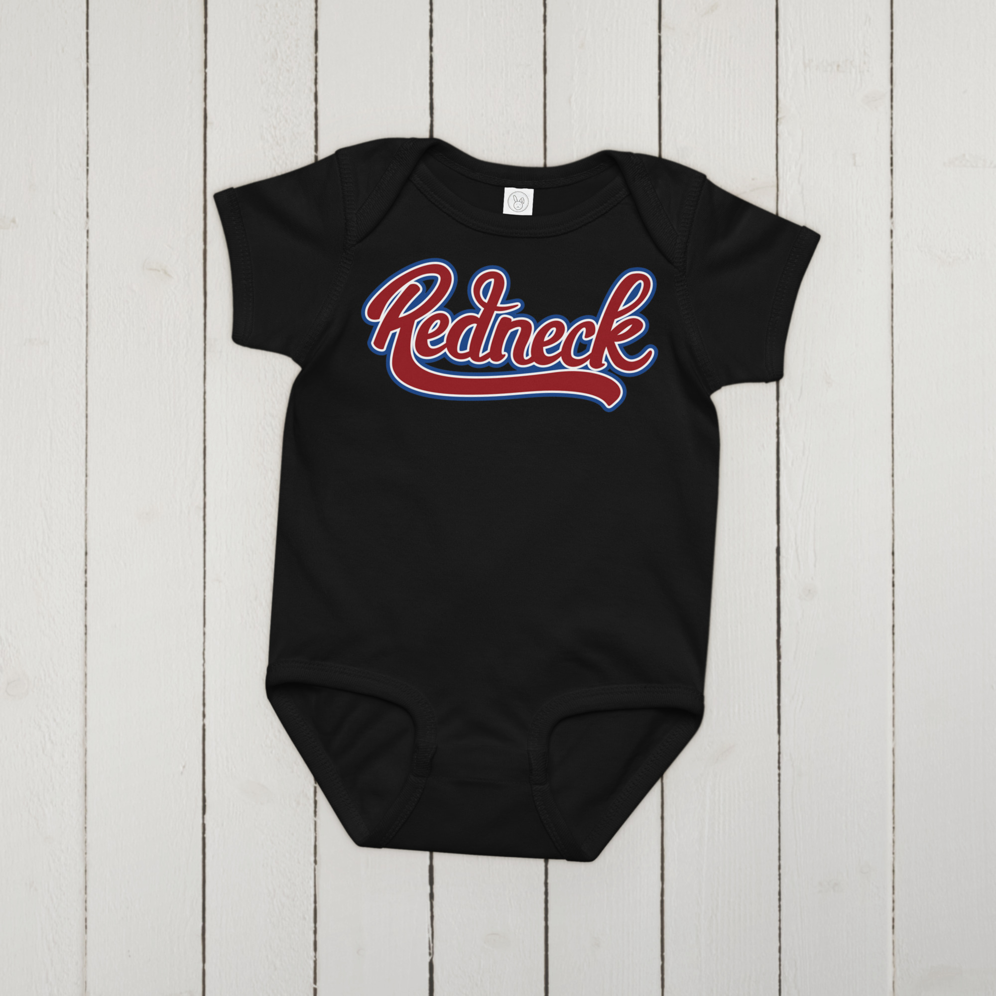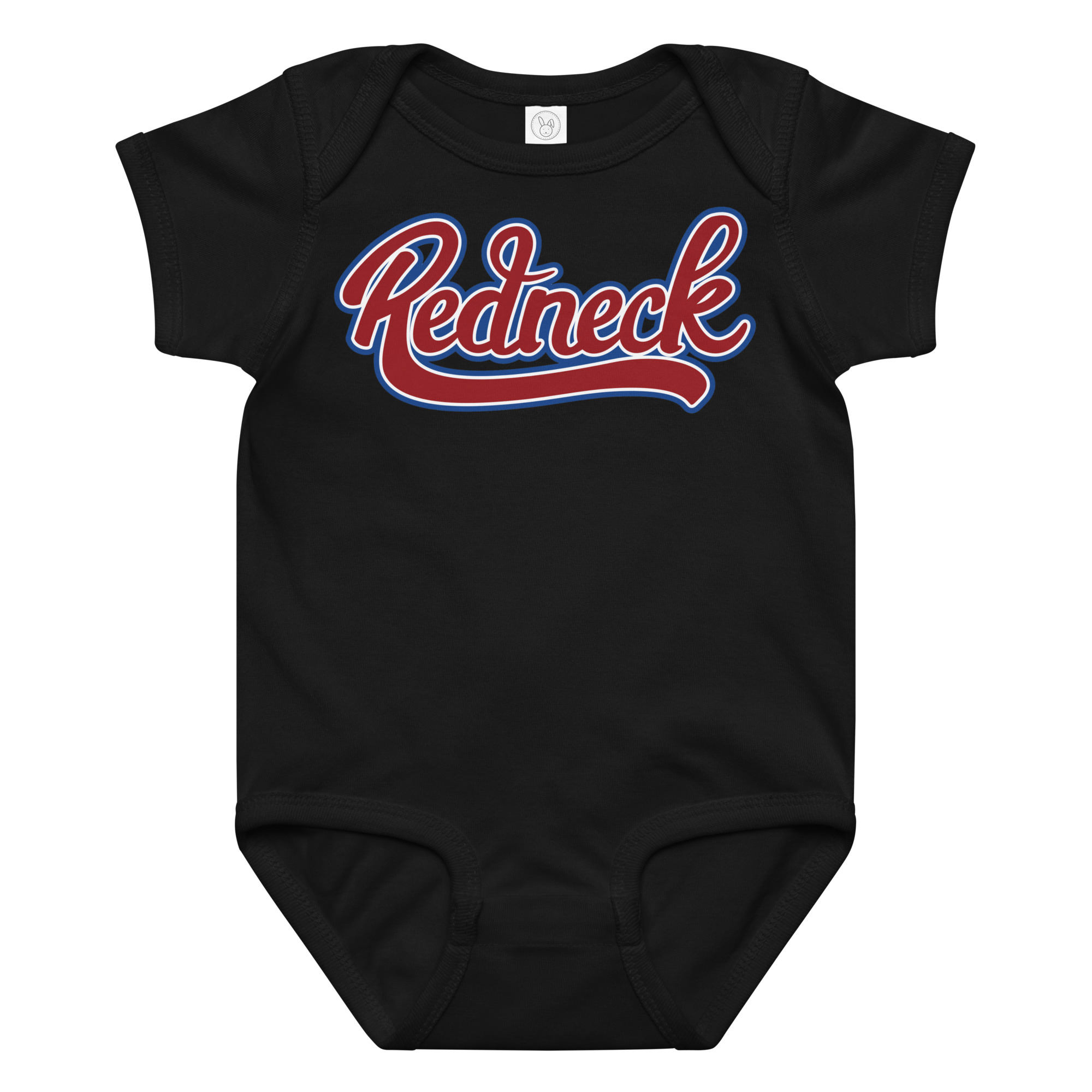 Riktigt söt body i svart med texten ’Redneck’ som dekoration på framsidan. Materialet är 100% ringspunnen bomull i en fin kvalitet. Passar alla små söta rednecks.