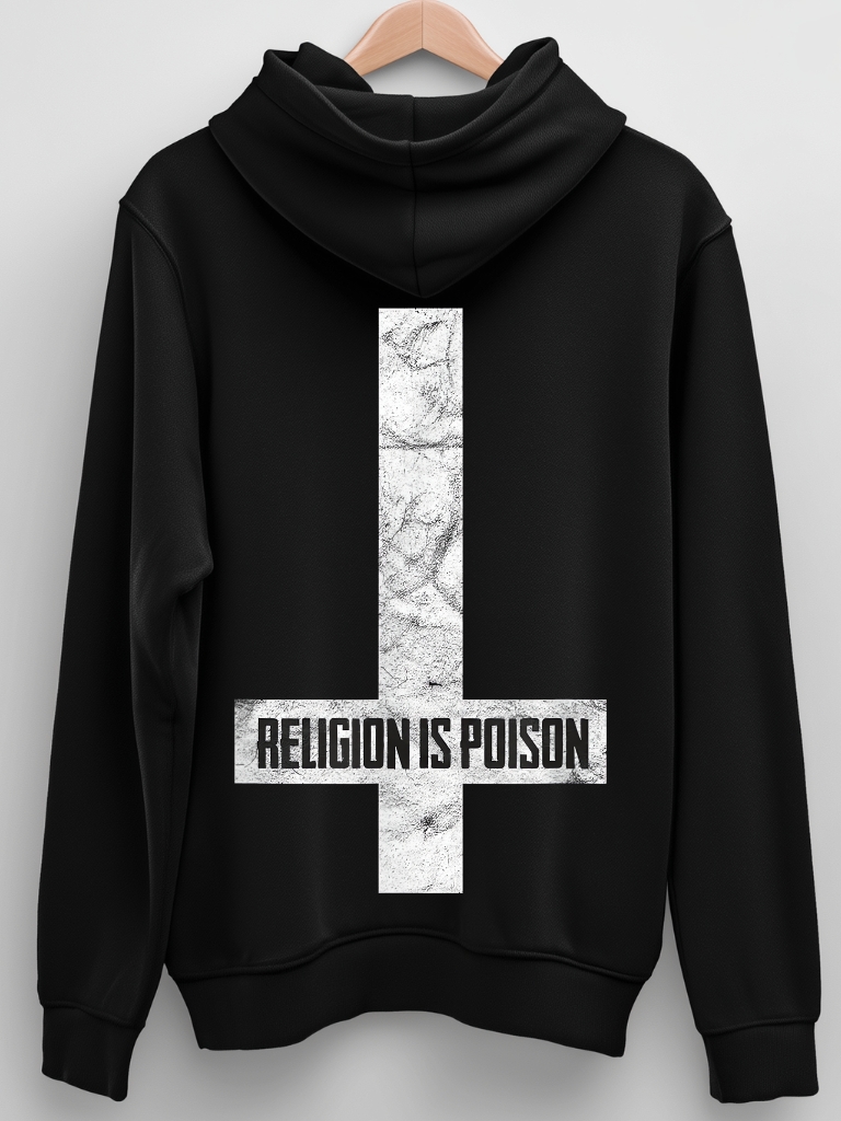 Snygg hoodie tillverkad i blandad bomull/polyester med ett stort upp- och nervänt kors och texten ’Religion is poison’ som dekoration på baksidan. Tröjan är i unisex-modell så den passar perfekt till både män och kvinnor.
