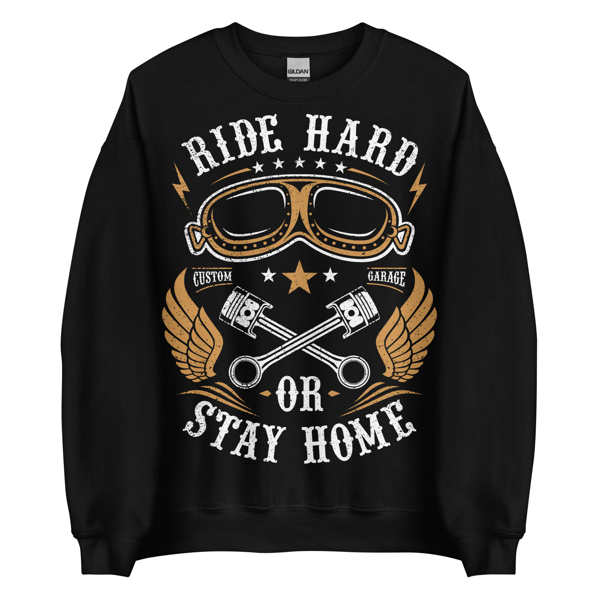 Varm och skön sweatshirt i svart tillverkad i blandad bomull/polyester med ett stort tryck med texten ’Ride hard or stay home’ som dekoration på framsidan. Tröjan passar perfekt till både män och kvinnor.
