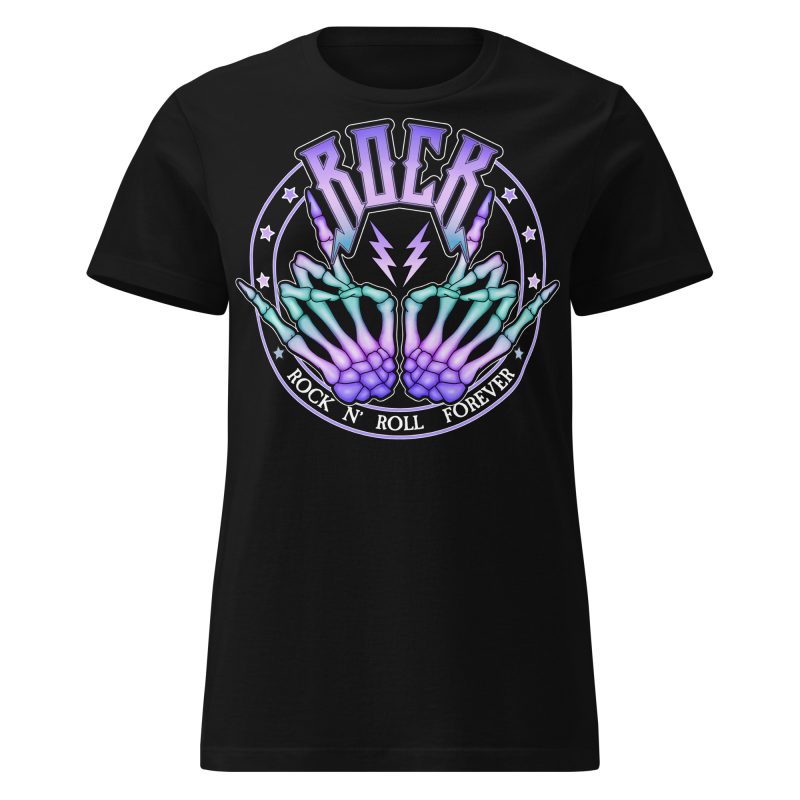 Semi-fitted t-shirt i svart med ett pastellfärgat motiv med två skeletthänder som visar ’horns up’ och texten ’Rock n’ roll forever’ som dekoration på framsidan. Passar perfekt till kvinnor som älskar hårdrock. Tröjan är tillverkad i en supermjuk kvalitet i 100% bomull.