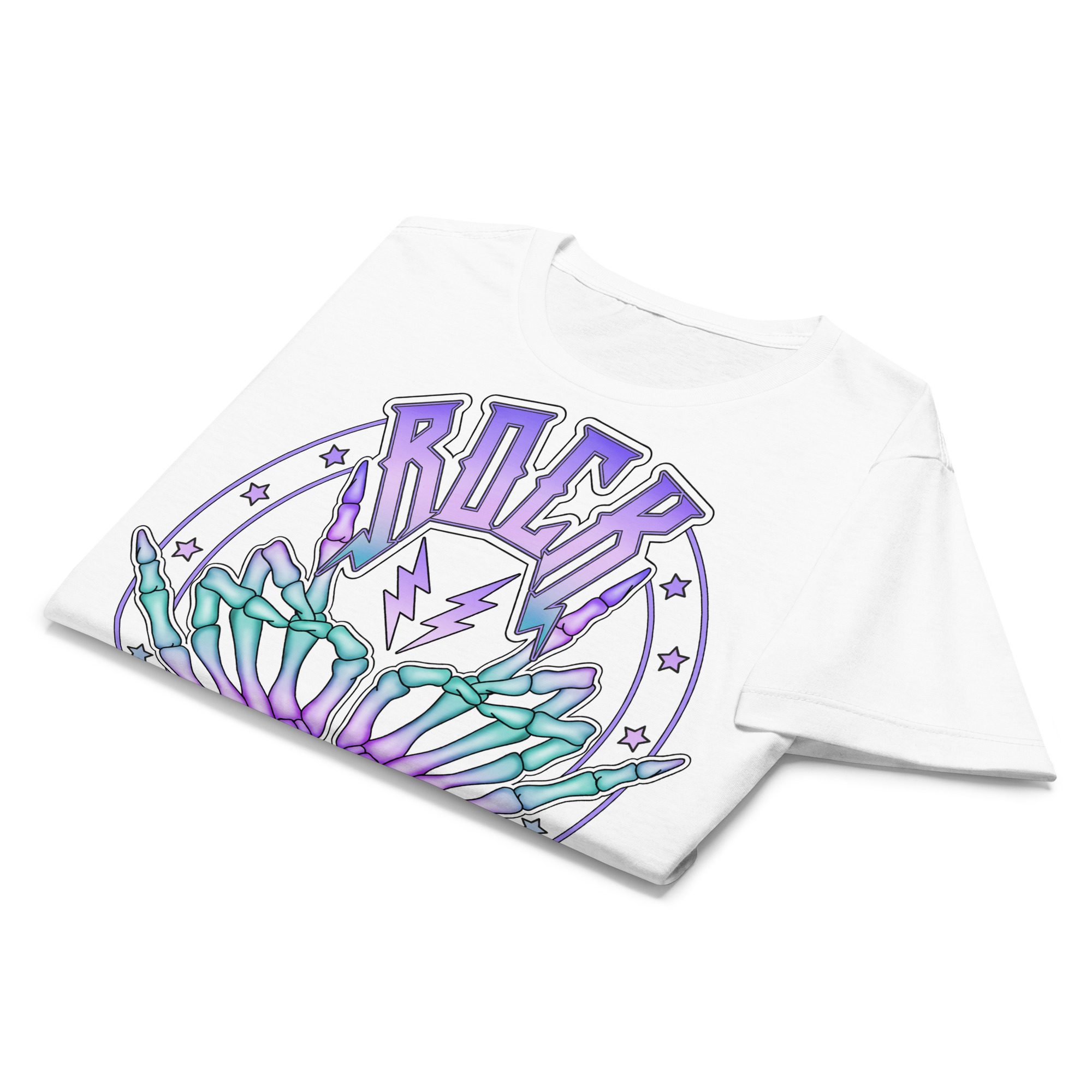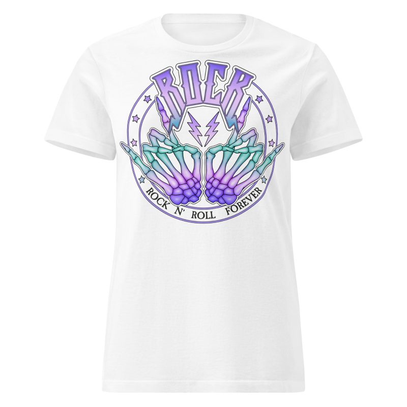 Semi-fitted t-shirt i vitt med ett pastellfärgat motiv med två skeletthänder som visar ’horns up’ och texten ’Rock n’ roll forever’ som dekoration på framsidan. Passar perfekt till kvinnor som älskar hårdrock. Tröjan är tillverkad i en supermjuk kvalitet i 100% bomull.