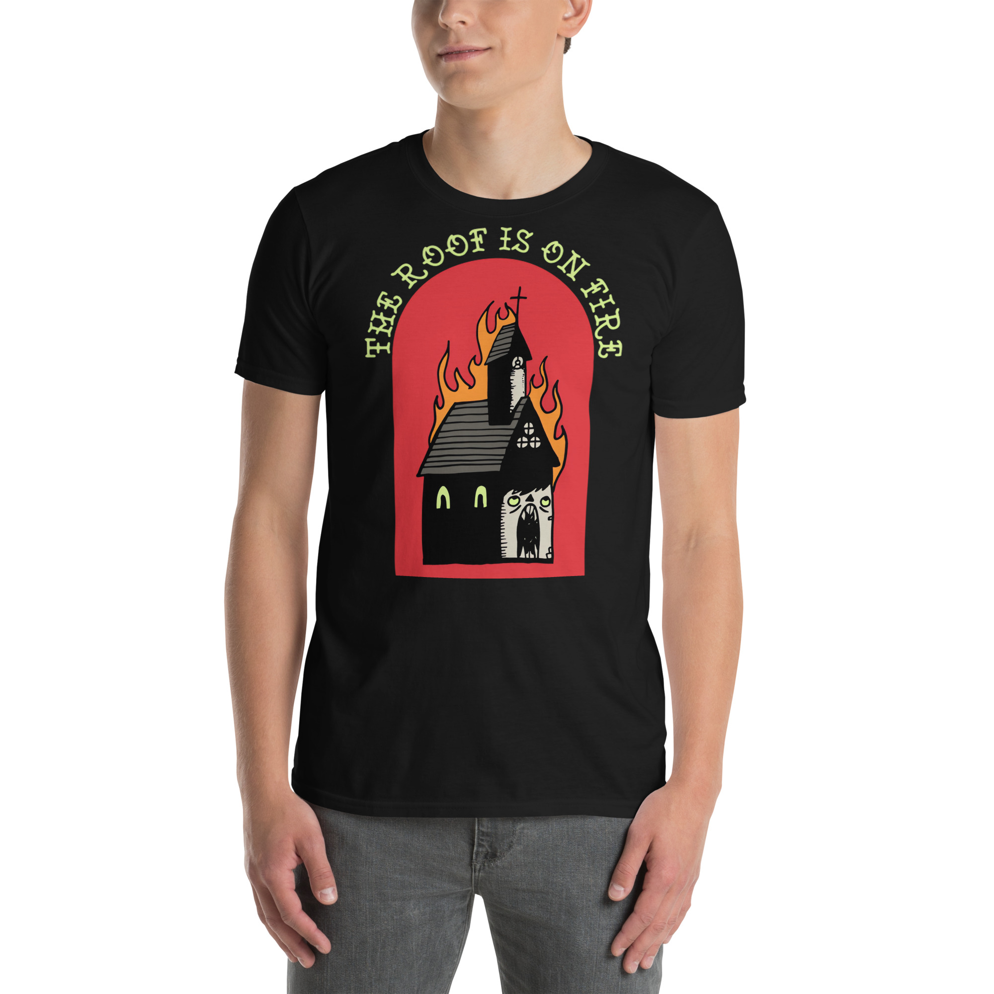 T-shirt i svart med en brinnande kyrka och texten ’The roof is on fire’ som dekoration på framsidan. Passar perfekt till både män och kvinnor som älskar alternativa kläder. Tröjan är tillverkad i en fin kvalitet i 100% bomull.