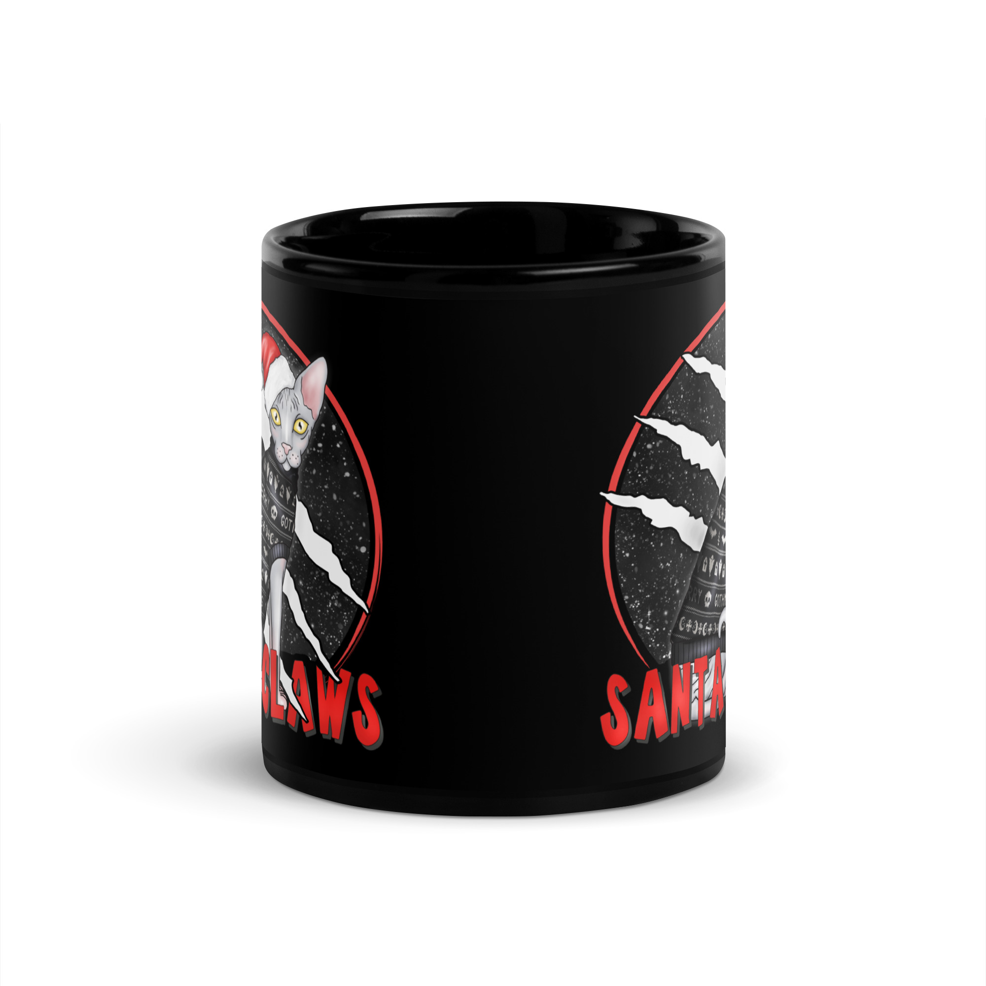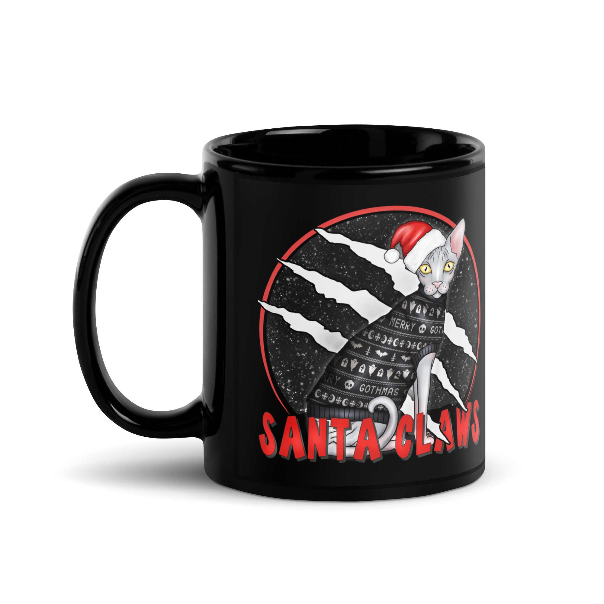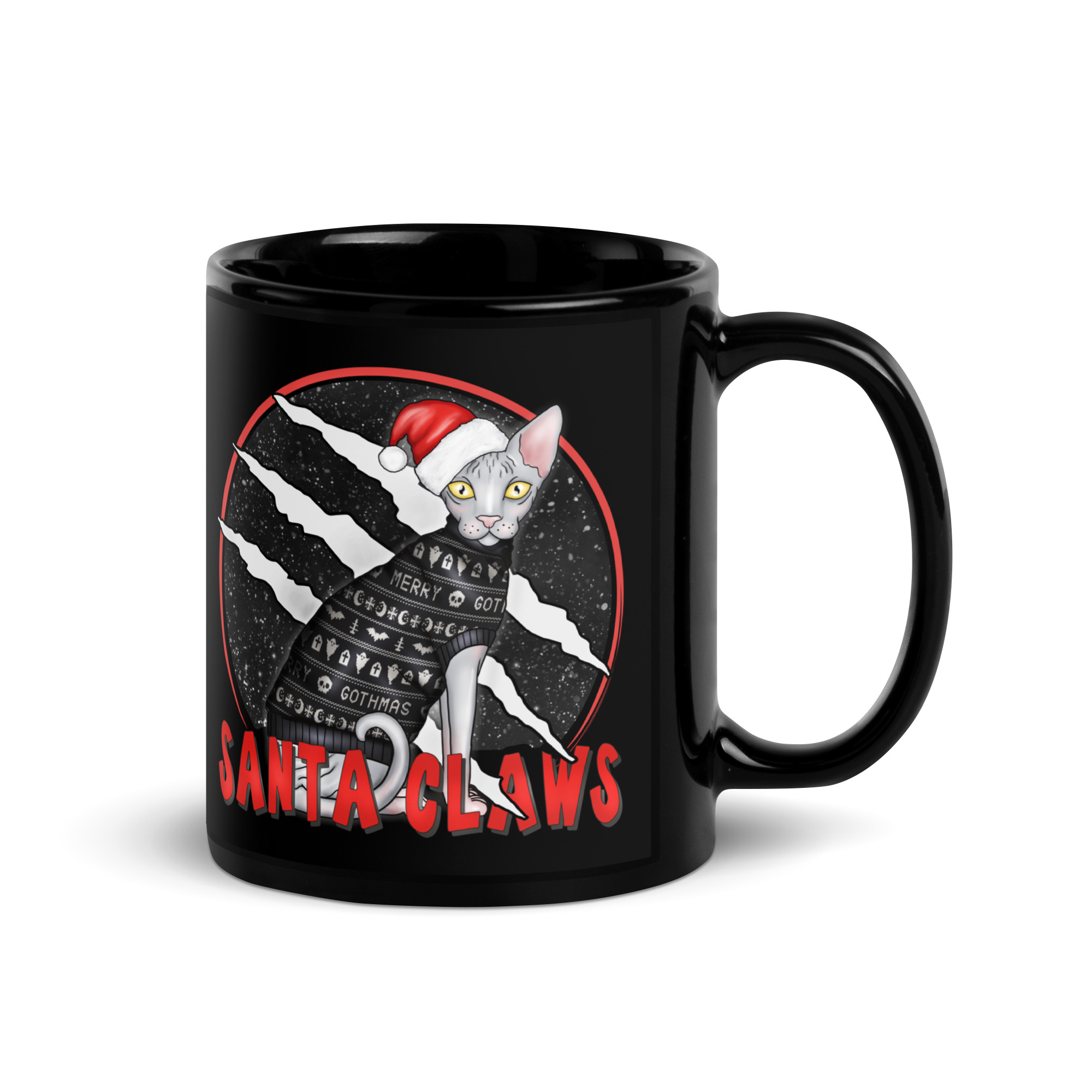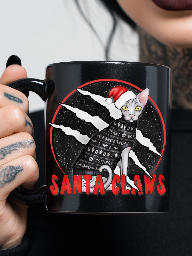 Mugg i svart med ett alternativt julmotiv med en sphynx-katt med en jultröja och texten ’Santa claws’ som motiv på båda sidorna. Muggen är tillverkad i svart glansig keramik. Passar alla som älskar den alternativa stilen.