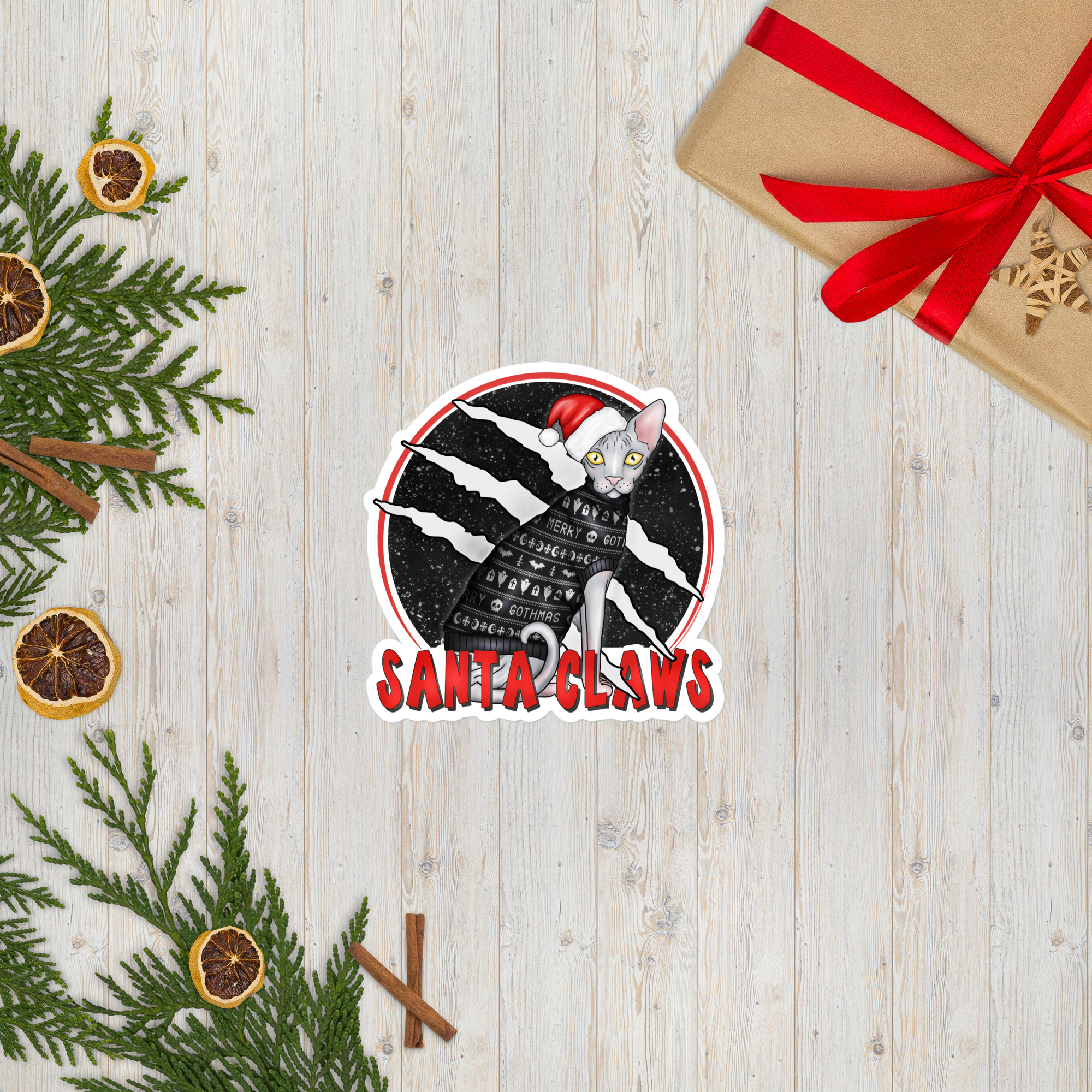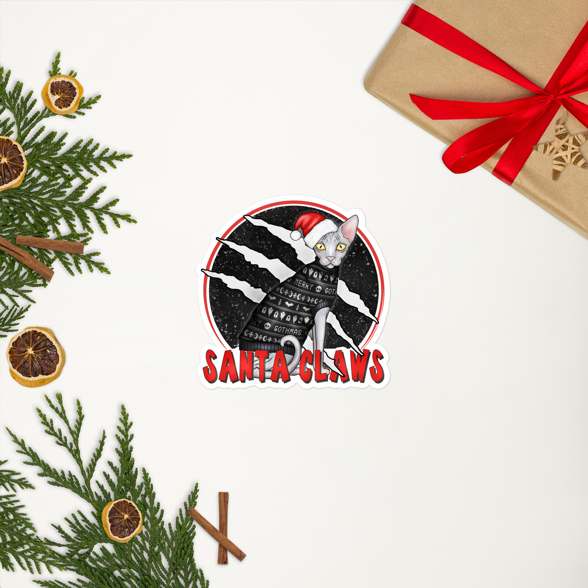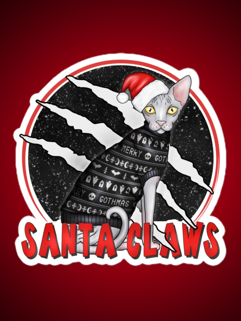 Sticker med ett alternativt julmotiv med en sphynx-katt med jultröja och texten ’Santa claws’ som tryck. Tillverkad i slitstark vinyl med en höjd på 10 cm. Kommer bli en perfekt dekoration på bilen, skrivboken eller din laptop.