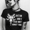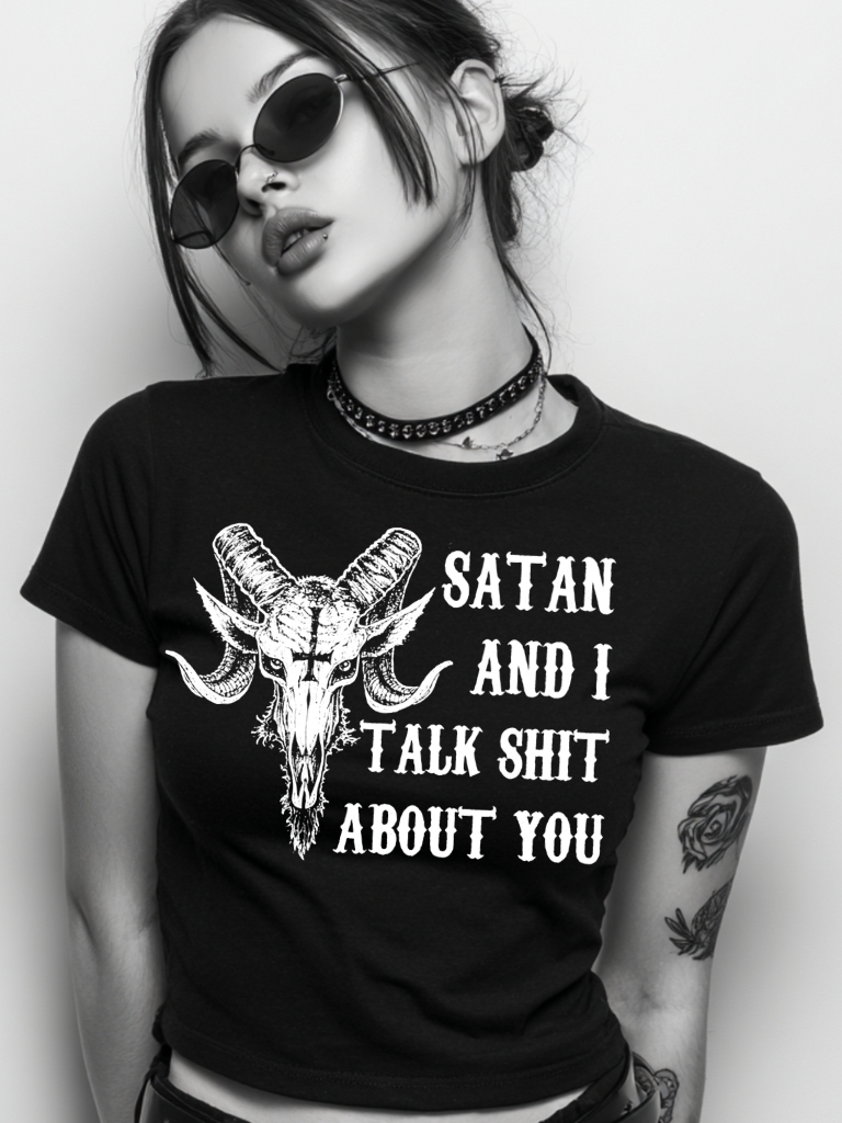 Snygg crop top dekorerad med ett stort alternativt tryck med ett bockhuvud och texten ’Satan and I talk shit about you’ på framsidan. Tillverkad i kammad bomull i en fin kvalitet. Passar alla kvinnor som älskar attityd.