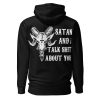 Hoodie i unisex-modell tillverkad i en extra fin kvalitet i blandad bomull och polyester. På baksidan återfinns ett stort alternativt tryck med ett bockhuvud och texten ’Satan and I talk shit about you’ som dekoration. Hoodien håller värmen riktigt bra och har ett otroligt mjukt tyg. Passar alla oss som älskar den alternativa stilen.