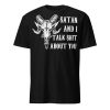 T-shirt i svart med ett stort alternativt tryck med ett bockhuvud och texten ’Satan and I talk shit about you’ som dekoration på framsidan. Passar perfekt till kvinnor och män som älskar alternativa kläder. Tröjan är tillverkad i en supermjuk kvalitet i 100% bomull.