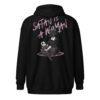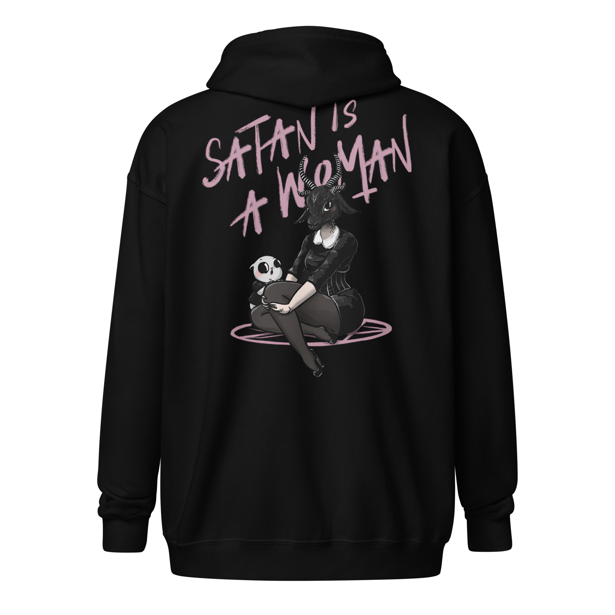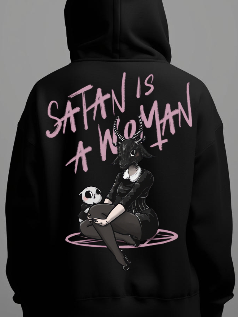 Hoodie med dragkedja och ett stort tryck på ryggen med en kvinnlig djävul och texten ’Satan is a woman’. Passar perfekt till både män och kvinnor, materialet är blandad bomull och polyester.