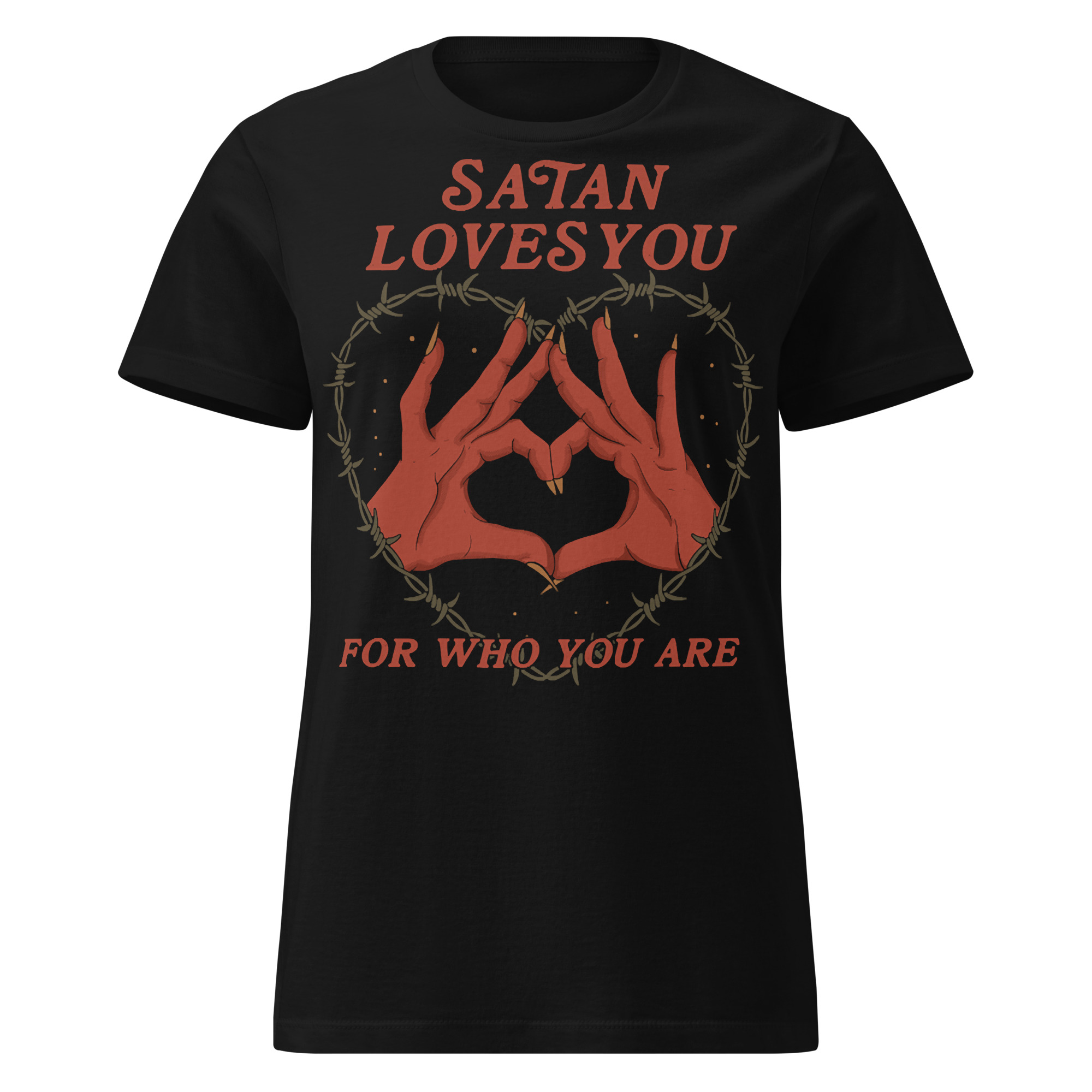 Snygg semi-fitted t-shirt i svart med djävulens händer som bildar ett hjärta och texten ’Satan loves you for who you are’ som dekoration på framsidan. Passar perfekt till kvinnor och är tillverkad i en supermjuk kvalitet i 100% bomull.