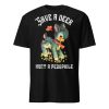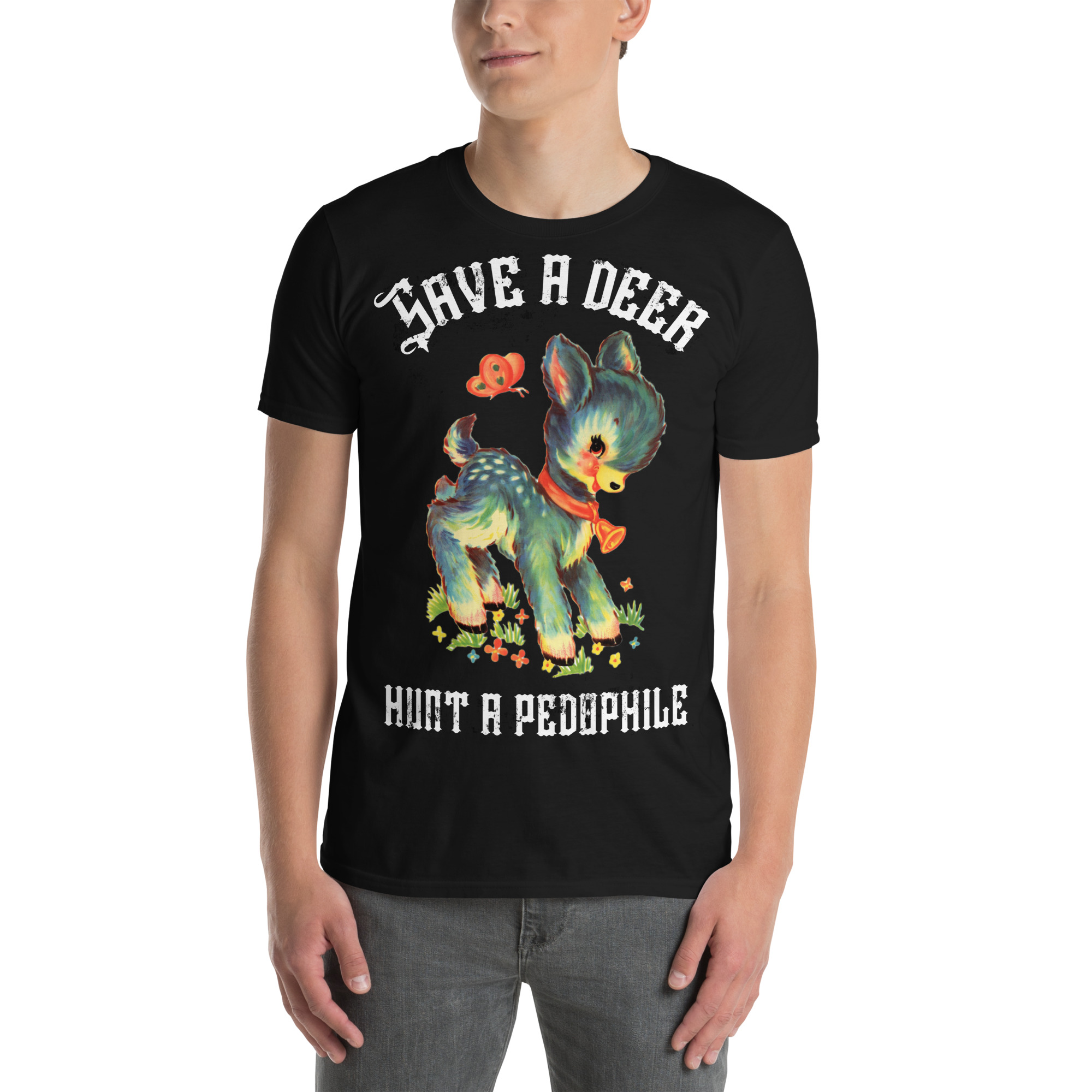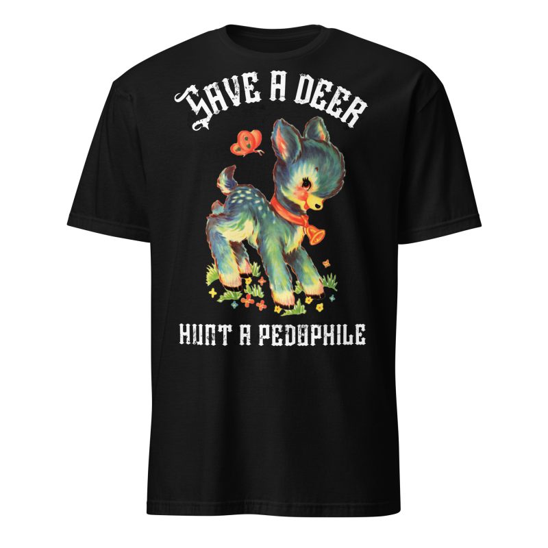 T-shirt i svart med ett stort retrotryck med en söt ren och texten ’Save a deer, hunt a pedophile’ som dekoration på framsidan. Passar perfekt till kvinnor och män som älskar den alternativa stilen. Tröjan är tillverkad i en supermjuk kvalitet i 100% bomull.
