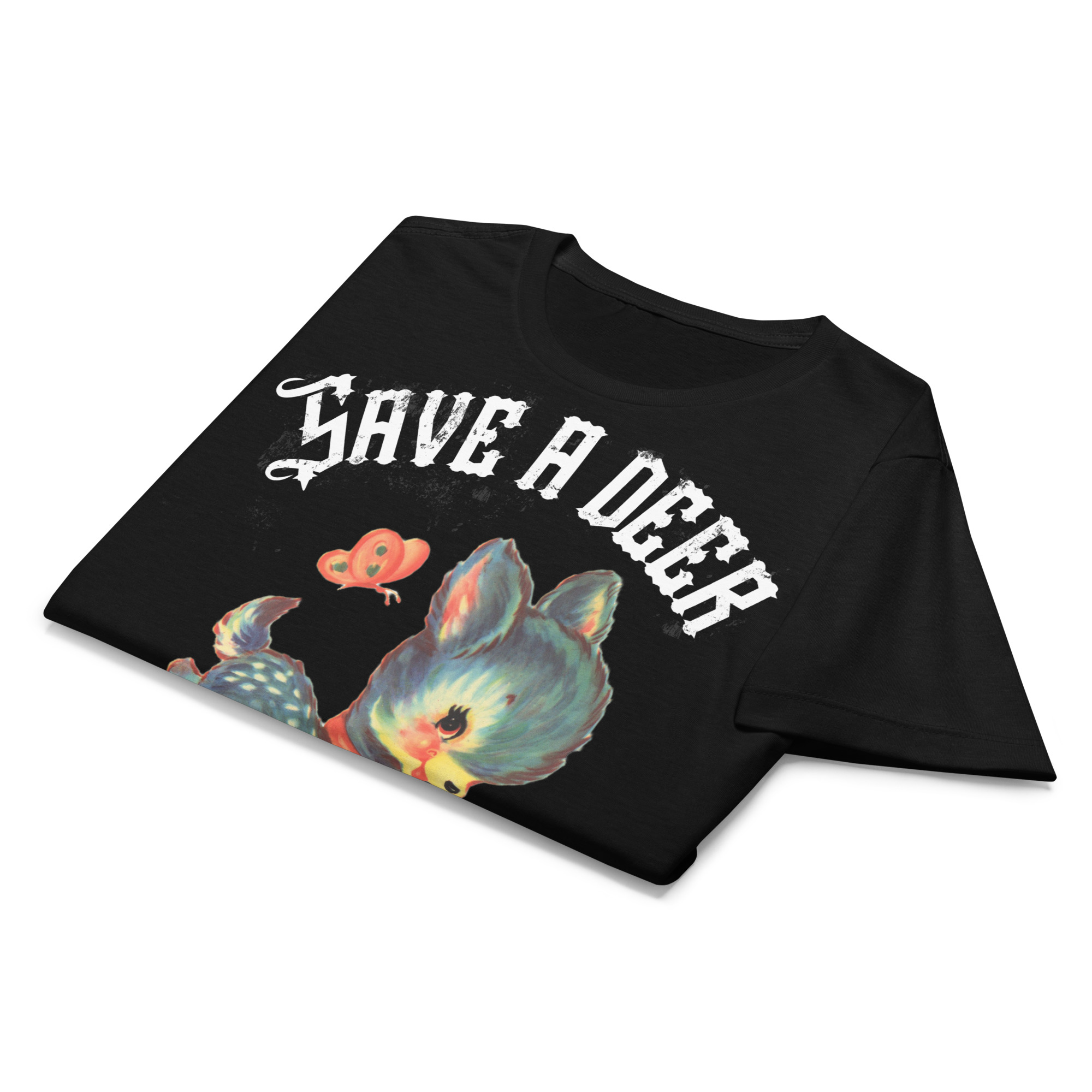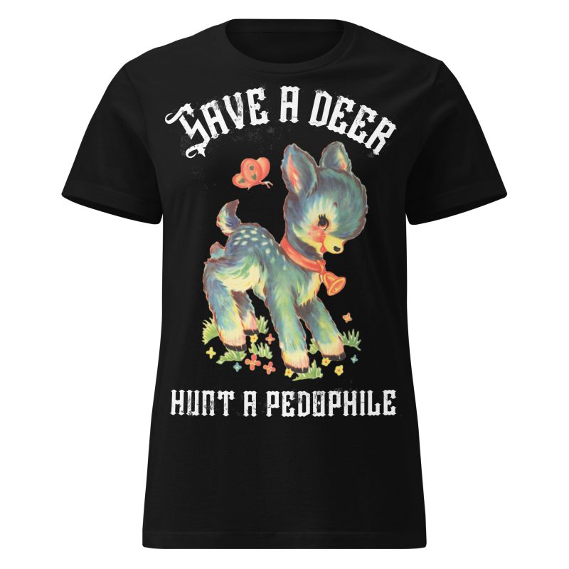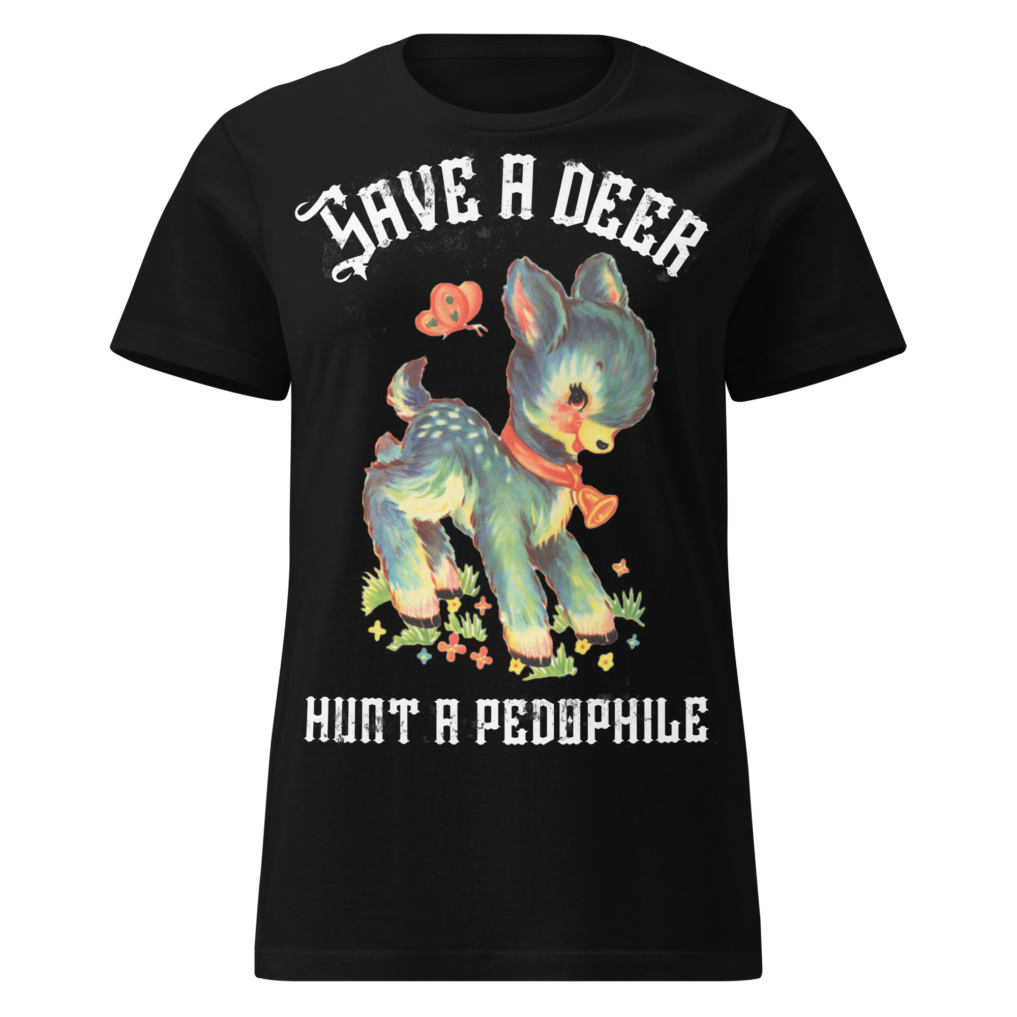 Semi-fitted t-shirt i svart med ett stort retrotryck med en söt ren och texten ’Save a deer, hunt a pedophile’ som dekoration på framsidan. Passar perfekt till kvinnor som älskar den alternativa stilen. Tröjan är tillverkad i en supermjuk kvalitet i 100% bomull.