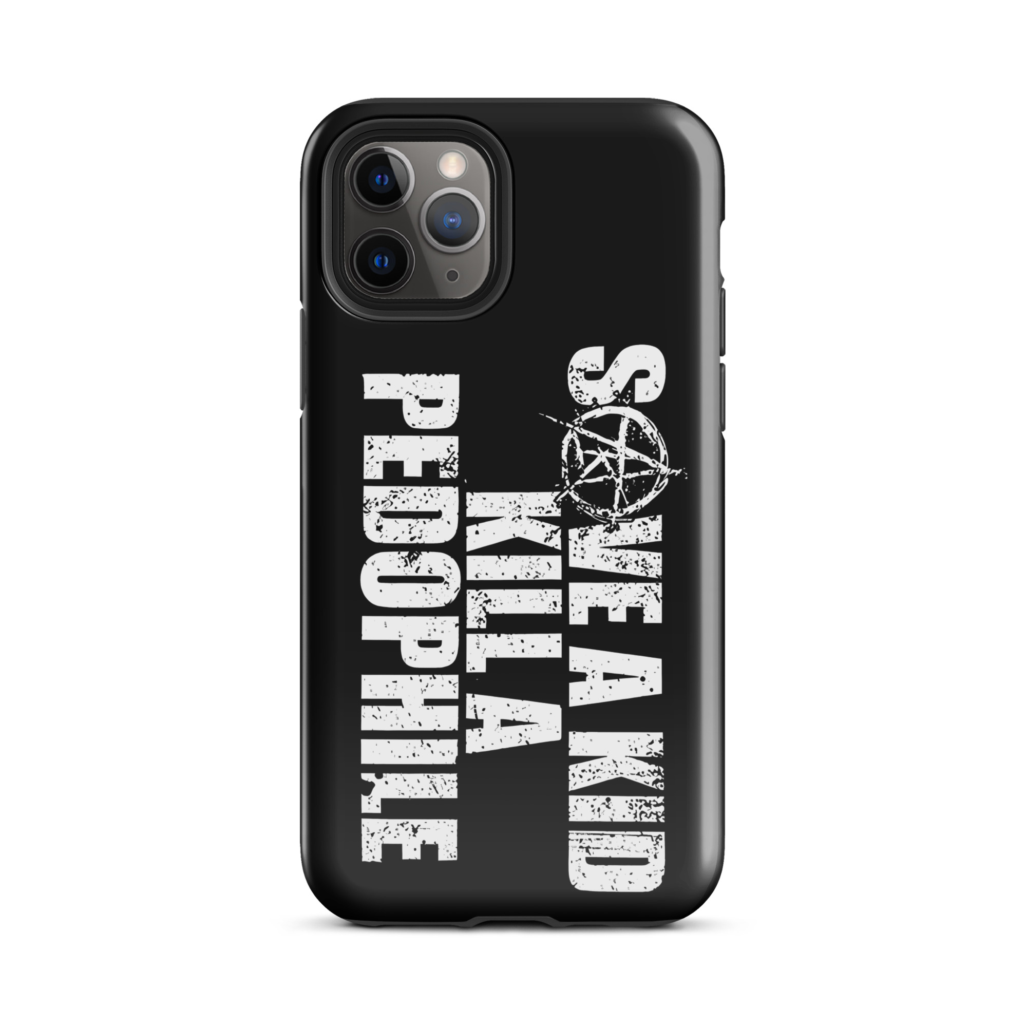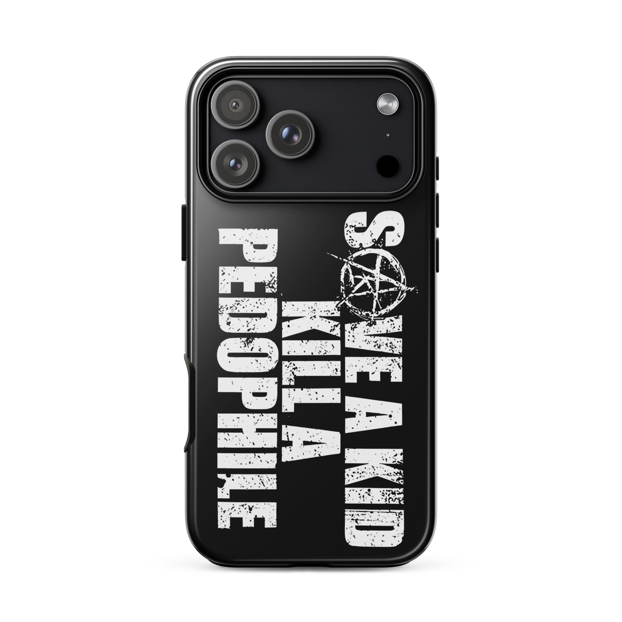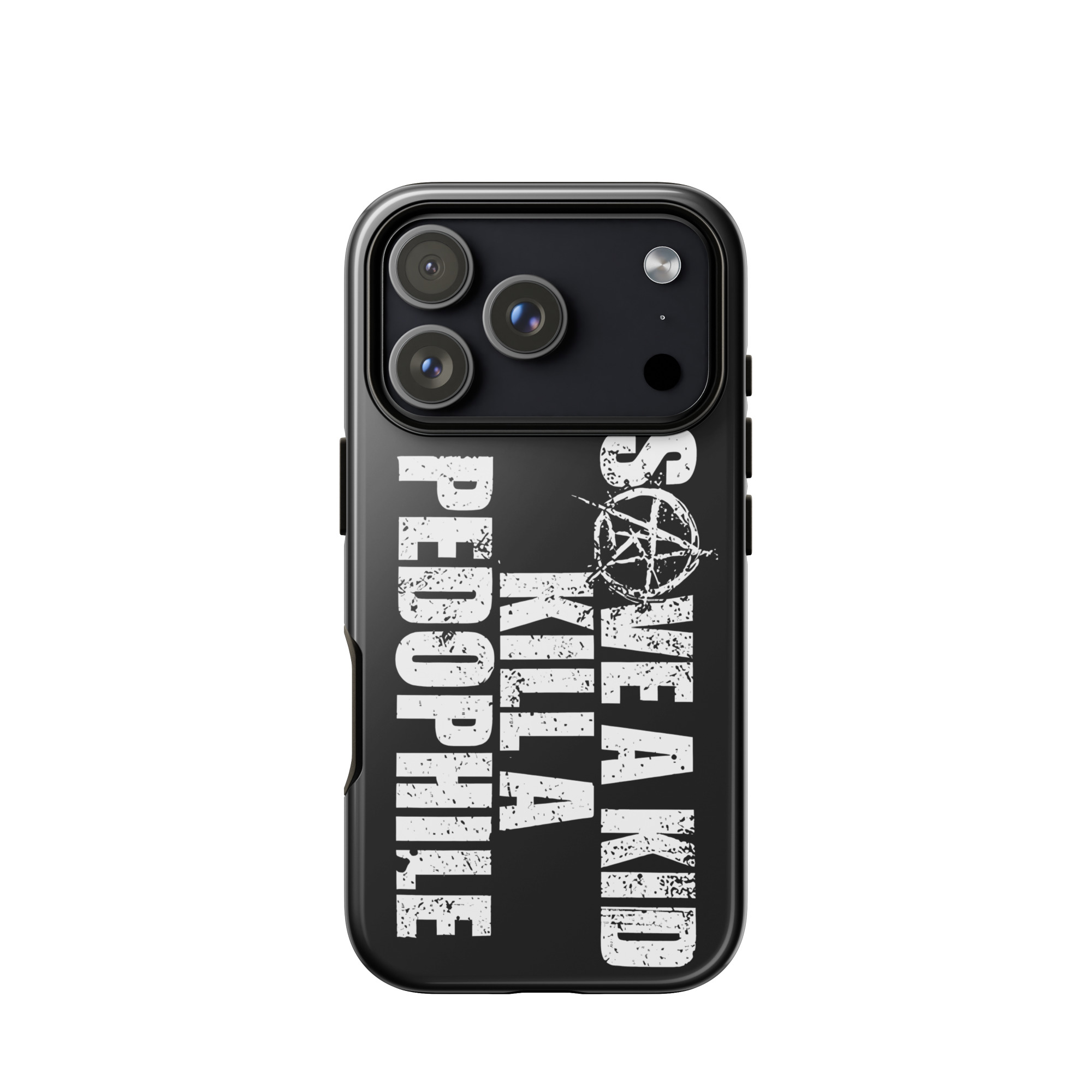 Mobilskal som passar iPhone-modellerna med texten ’Save a kid, kill a pedophile’ som dekoration. Tillverkad i hög kvalitet och skyddar baksidan och sidorna på din telefon mot repor, smuts, olja och damm. Skalet är väldigt slitstarkt på grund av dubbla lager material.
