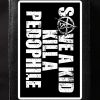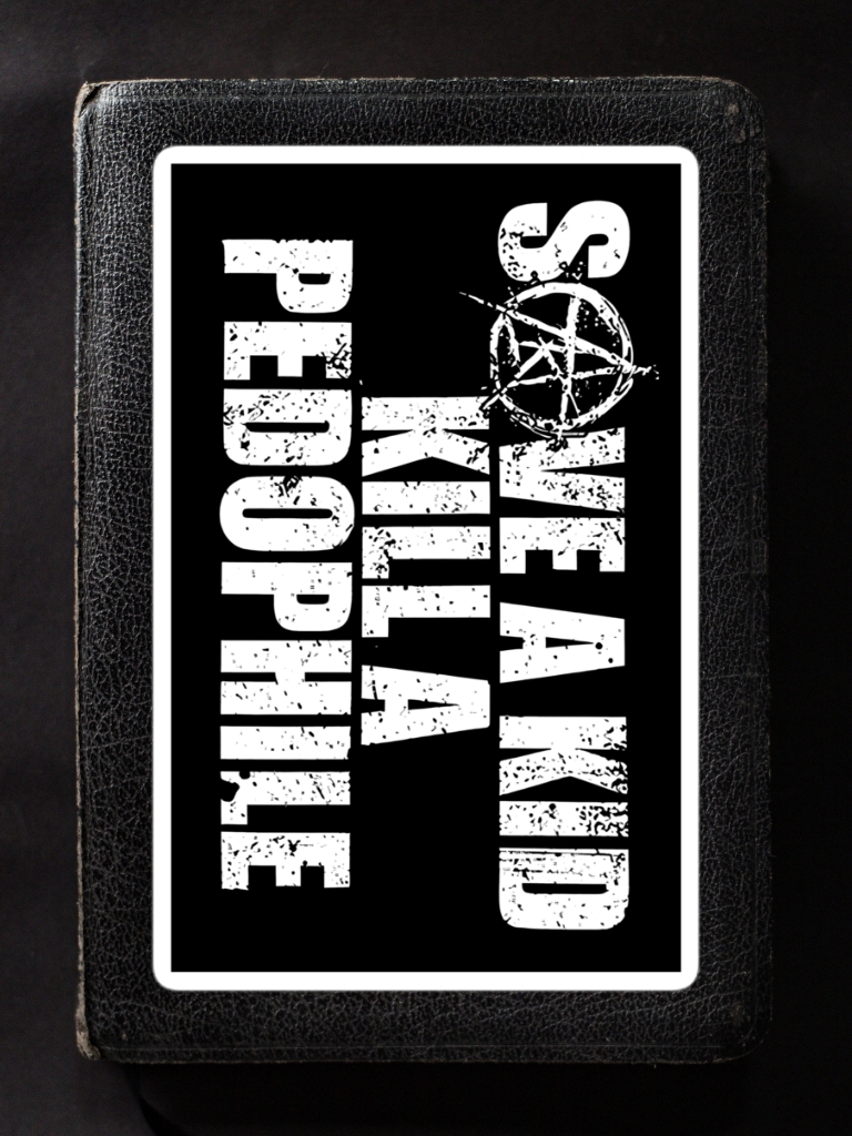 Sticker med texten ’Save a kid, kill a pedophile’ som tryck. Tillverkad i slitstark vinyl med en längd på 14 cm. Kommer bli en perfekt dekoration på bilen, skrivboken eller din laptop.