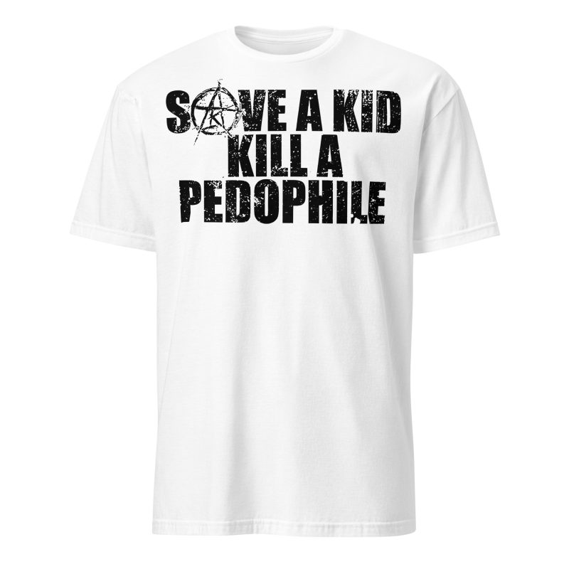 T-shirt i vitt med texten ’Save a kid, kill a pedophile’ som dekoration på framsidan. Passar perfekt till kvinnor och män som älskar den alternativa klädstilen. Tröjan är tillverkad i en supermjuk kvalitet i 100% bomull.