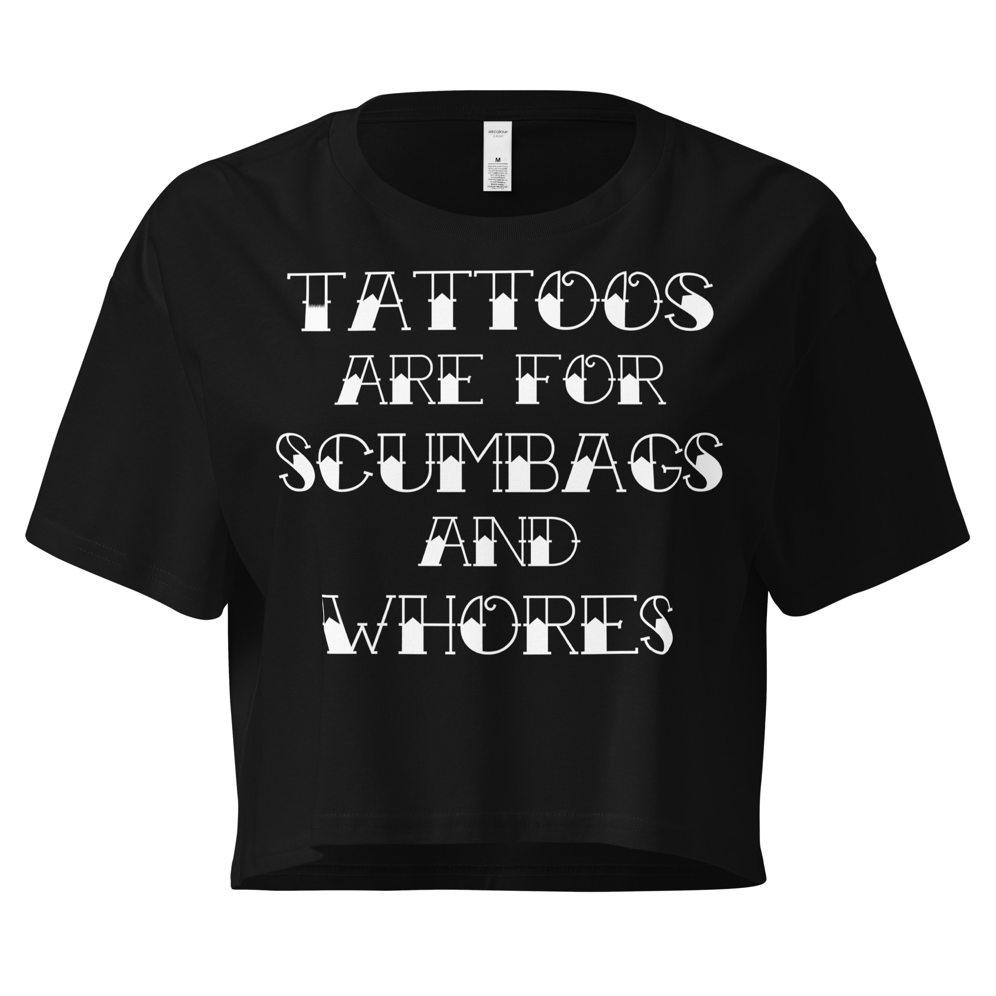 Snygg crop top dekorerad med texten ’Tattoos are for scumbags and whores’ på framsidan. Tillverkad i kammad bomull i en fin kvalitet. Passar alla kvinnor som vet att tatueringar endast är för scumbags och horor.